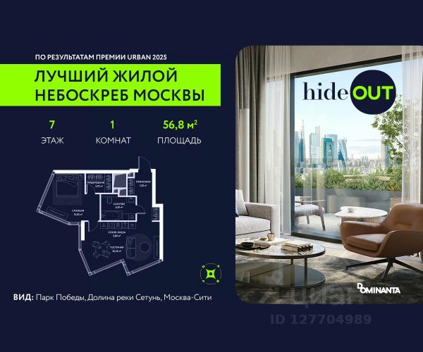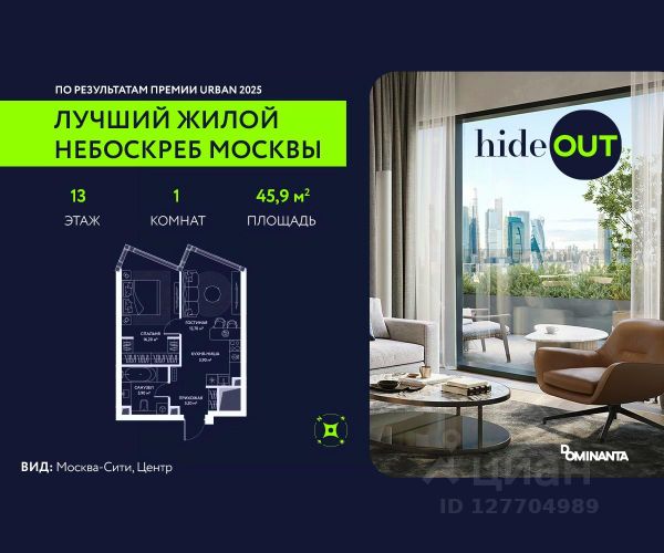 Прямая продажа от застройщика. Продается 1-комнатная квартира площадью 42,7 кв.м. на 4-м этаже 34-этажного дома в ЖК hideOUT с панорамными видами: Во двор. Высота потолков 3,25 м. hideOUT — премиальный проект компании Dominanta. Это новый уровень жизни и комфорта без компромиссов. Две башни — 34 и 49 этажей — открывают захватывающие виды на Москву. Архитектурной доминантой проекта становится мост, соединяющий башни на высоте 80 метров. Закрытая территория, охрана 24/7, зона экстренной безопасности на подземном уровне, система пожаротушения. На мосту между башнями на 22-м этаже находится SocialHUB — предусмотрено 16 комфортных пространств для работы, отдыха и развлечений с панорамными видами и клубным форматом доступа. Концепция благоустройства hideOUT — баланс между природой и технологичным городом будущего. На территории сада предусмотрены 15 зон для отдыха, работы, спорта и детей. Знаковым местом станет центральная площадь с амфитеатром и водопадом — сочетание камней, растений и струящейся воды создает идеальный баланс с природой. В проекте действуют привлекательные условия покупки: - рассрочка 0% на 3 года с первоначальным взносом от 20%. Период рассрочки до 36 месяцев. - скидка до 20% при 100% оплате стоимости лота и ипотеке без субсидирования. Предложение действует до 31.12.2025.