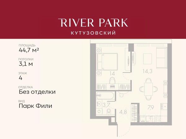Продается 1-к квартира площадью 48.5 кв.м. на 16-м этаже в жилом комплексе премиум-класса River Park Кутузовский в Башне Lazur Tower О жилом комплексе. Премиальный жилой комплекс River Park Кутузовский строится в одном из самых престижных районов столицы Дорогомилово, на берегу Москвы-реки. Яркий проект в стиле эко-футуризма станет самым масштабным и самым высотным ЖК в локации Кутузовского проспекта. В проекте будет впервые воплощена концепция Family Premium. Расположение и Транспортная доступность: - На берегу Москвы-реки, напротив Москва-Сити - 600 метров до Кутузовского проспекта - Удобный съезд с ТТК - Прямой выезд на МКАД по Северному дублеру Кутузовского проспекта. - В пешей доступности 3 станции метро: Фили, Парк Победы, Кутузовская, а также станция МЦД Фили. Архитектура от именитого бюро ADM отличается уникальной пластикой фасадов - башни словно парят в воздухе, играя гранями как драгоценные камни. Жилой комплекс состоит из 5-ти небоскребов с home park на закрытой территории и внешней торговой галереей с открытым доступом. В закрытом внутреннем дворе уникальная по насыщенности клубная инфраструктура - 5 Towers Club только для жителей: - Многофункциональная спортивная площадка (баскетбол, футбол, воллейбол, большой теннис) - Детский игровой клуб NEMO - Life Rooms с караоке, барной стойкой и meeting room - Music salon - Gedonist Club с бильярдной - Beauty station - Гольф-симулятор Впервые в Москве lounge зоны на крыше небоскребов, только для жителей: - Всесезонные беседки иглу - Джакузи - Барная стойка - Грили - Площадка для занятий йогой - Самые высоки качели на крыше в России - Видовые площадки Благоустройство комплекса занимает 3 гектара и разработано мировым экспертом по городским парковым ландшафтам - голландским бюро WEST8. Концепция проекта дать жителям отдохнуть от городского ритма, расслабиться среди природы и натуральных материалов. В home park будут высажены многолетние деревья по принципу no allergy. - Зеркальный пруд с арт-объектом - Две детские площадки - Work out с навесом - Цветущий сад - Party lounge - Видовая зона отдыха с очагом - Солярий На территории жилого комплекса планируется строительство крупного образовательного центра: детский сад на 200 мест и школа на 460 мест.