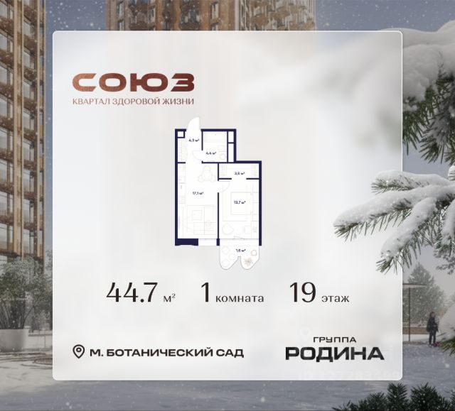 Рассрочка 0% Продаётся 1-комнатная квартира площадью 54.5 м² на 9 этаже в Жилом Комплексе "Союз". Квартал здоровой жизни премиум-класса с рекордным количеством олимпийских видов спорта: - Ледовая арена для хоккея и фигурного катания, - Футбольные поля для тренировок, - Спортивный зал для фехтования, - Бассейн на 6 дорожек, - Центр единоборств, - 4 крытых площадки для настольного тенниса, - 7 теннисных кортов (крытых и открытых), - 4 крытых площадки для сквоша, - Легкоатлетический стадион, - Площадки для баскетбола и волейбола. Уникальные форматы квартир с мастер-спальнями, приватными террасами, балконами, а также пентхаусы с открыточными видами на город. Все квартиры продаются с отделкой Shell&Core и панорамным остеклением. Расположение Пешком: - 2 мин. до парка "Сад Будущего"; - 6 мин. до ст. м. "Ботанический сад"; - 6 мин. до ст. МЦК "Ботанический сад"; - 6 мин. до парка "Леоновская роща"; На автомобиле: - 2 мин. до СВХ (МСД); - 5 мин. до Проспекта Мира; - 10 мин. до ТТК; - 15 мин. до Садового кольца; - 25 мин. до аэропорта "Шереметьево". Благоустройство - собственная спортивная инфраструктура 7 Га; - зона для пикников; - игровые и спортивные площадки для детей всех возрастов; - розарий, а также сосновые, каштановые и дубовые аллеи; - площадки под открытым небом для занятий спортом и йоги; - игровые комнаты для детей; - лаунж-зона для резидентов; - просторная переговорная для деловых встреч; - премиальный ресторан "Шабада" Сосо Павлиашвили с водными арт-объектами на прогулочной аллее, садом ароматных трав и сценой под открытым небом; - кафе, химчистки, аптеки и супермаркеты рядом с домом. Окружение - 8 парков: Сад Будущего, Леоновская роща, Хуамин, Главный ботанический сад РАН, Шереметьевская дубрава, Останкино, парк спорта "Яуза", пойма реки Яуза и музей-усадьба "Останкино"; - 3 ВУЗа: ВГИК, РГСУ, МГПУ; - 12 школ, в том числе: школа 1499 им. И.А. Докукина (топ 100), Brookes Moscow, IThub школа; - 18 детских садов, в том числе билингвальный ALERTUM KIDS; - один из крупнейших океанариумов Европы "Москвариум"; - один из крупнейших в Европе торгово-развлекательных центров "Европолис".