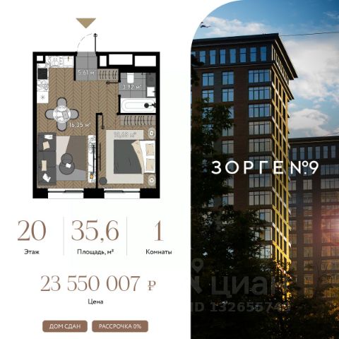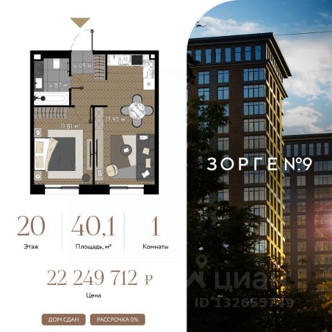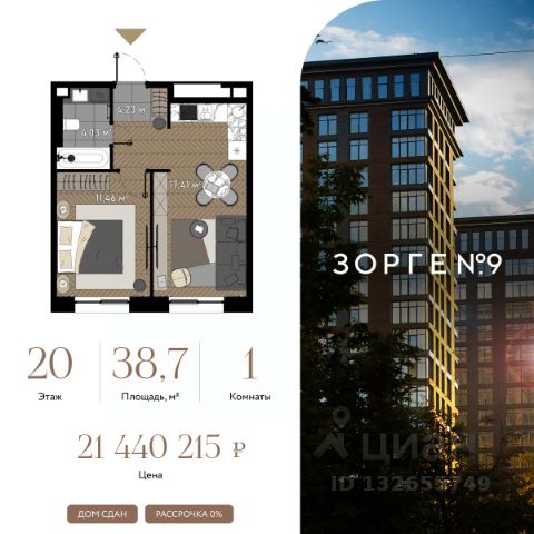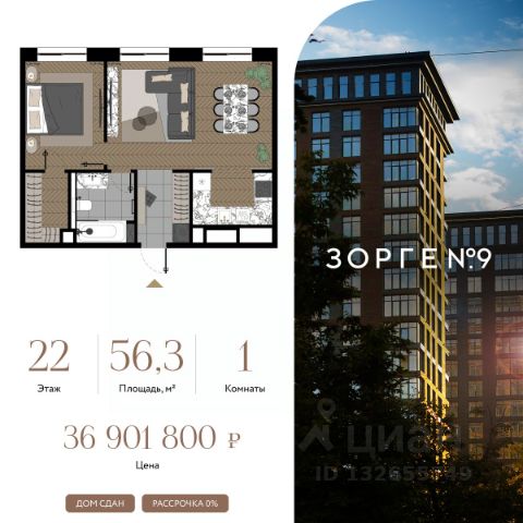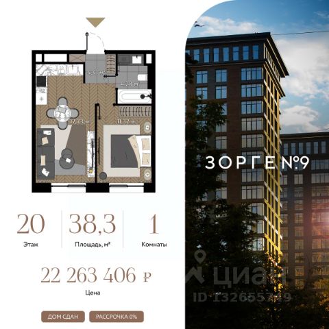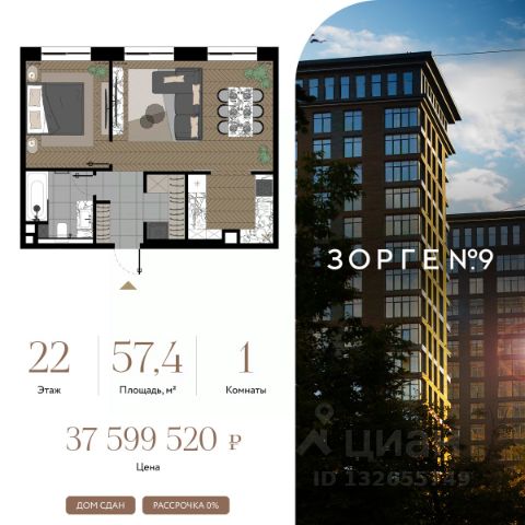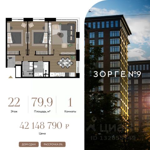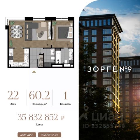 "Зорге 9" — готовые апартаменты бизнес-класса на Ходынке. 10 минут до Москва-Сити. Архитектура: 3 современных корпуса с фасадами в стиле архитектуры Нью-Йорка и с сервисами премиальных отелей, высотой до 23 этажа. Строгие линии, панорамные окна создают ощущение неподдельной роскоши и комфортной жизни в сердце мегаполиса. Проект награжден авторитетной премией European Property Awards. Резиденции: Свободная планировка, небольшая глубина этажа, огромные панорамные окна в пол до 3,6 м и высота потолков до от 3,3 до 4,3 м позволяют реализовать самые смелые концептуальные идеи и создать идеальный интерьер с учетом всех пожеланий. Вдохновляющие виды на город украсят ваш апартамент лучше любой картины. Есть возможность приобретения дизайн-проекта и полной меблировки апартаментов от партнеров девелопера. Расположение: 3 мин. пешком до парка Березовая роща 10 мин. пешком до Ходынского поля 10 мин. до ТЦ Авиапарк 30 минут до Шереметьево 10 мин до Москва-Сити или 1 станция до Москва-Сити 5 минут до ТТК 4 станции метро в шаговой доступности: 6 мин м. Полежаевская (фиолетовая ветка) 7 мин МЦК Зорге (МЦК) 7 мин м. Хорошевская (голубая ветка) 10 мин МЦК Хорошёво (МЦК) Благоустройство: Собственный парк 2 га с амфитеатром и поющими фонтанами. В парке высажено 136 деревьев и более 11 000 кустов и мелких растений из немецких питомников. Площадка для йоги и воркаут-зона со спортивными площадками. Теннисные столы и детский плейхаб Две башни Авторское гранд-лобби В лобби предусмотрена лаундж-зона, чайная с камином, комната для хранения велосипедов и колясок. Доступ по системе FACE ID. В отделке лобби и лифтовых холлов использован декоративный камень итальянского бренда Atlas Concorde Пентхаусы На верхнем уровне комплекса расположены роскошные просторные пентхаусы с высотой потолка до 4,2 метра и панорамными окнами до 3,6 метров, открывающими великолепные виды на столицу. Пентхаусы с выходами на собственные приватные террасы на кровле, площадью от 150 кв. м являются жильем high-уровня, демонстрирующим высокий статус владельца.