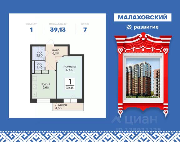 Продается 1-к квартира площадью 40.13 кв. м с черновой отделкой. Квартира расположена на 6 этаже 19 этажного дома, в 201 корпусе. "Малаховский" - жилой комплекс в Раменском районе Подмосковья, идеально подходящий для семей с детьми. Проект от федерального застройщика ГК "Развитие" находится в тихом и зеленом микрорайоне Родники и отличается удобной транспортной связью с Москвой и Люберцами. Три дома высотой 17 этажей с видами на озеро и парк, просторные квартиры, приватный двор-патио с ландшафтным дизайном и доступная инфраструктура обеспечат жителям новых квартир все преимущества городской жизни в живописном природном окружении. Транспортная доступность - Удобный выезд на Егорьевское шоссе и строящуюся магистраль МЕТК (Москва - Егорьевск - Тума - Касимов); - 18 км от МКАД; - 5 мин. до МЦД-3 "Удельная"; - 29 мин. до метро "Лермонтовский проспект". Архитектура Дома отличаются высокой тепло- и шумоизоляцией, долговечностью, высоким уровнем энергоэффективности и современным внешним видом. Фасады выполнены в спокойной цветовой гамме. Из окон с широкоформатным остеклением открываются виды на березовую рощу, озеро и зеленые дворы. Логичным продолжением архитектуры становятся просторные входные группы, где продумано всё: витражное остекление, высокие потолки, дизайнерская отделка, два выхода на обе стороны дома, а также современные лифты (грузовой и пассажирский) и колясочные. Планировочные решения Планировки комплекса "Малаховский" функциональны и эргономичны, что упрощает зонирование и расстановку мебели. Квартиры оснащены гардеробными, лоджиями с панорамным остеклением, двумя санузлами (даже в однокомнатных) и просторными прихожими. Высота потолков - 2,7 м. Квартиры сдаются с отделкой white box, которая позволит воплотить индивидуальный дизайн-проект по своему вкусу. Доступны варианты отделки "под ключ" с применением лучших дизайнерских материалов. Благоустройство В жилом комплексе тщательно продумана концепция благоустройства. Через всю территорию тянутся живописные прогулочные бульвары с ландшафтным дизайном и всесезонным озеленением. Рядом обустроено 3 современных детских площадки с мягким покрытием, а для взрослых предусмотрены уютные лаунж-зоны для общения, тихого отдыха и спорта на свежем воздухе. Двор каждого дома свободен от машин, а для дополнительного уюта и безопасности здесь установлено современное освещение. Естественным продолжением дворового ландшафта становится березовая роща с природными тропинками и небольшим водоемом, прилегающая к жилому комплексу. Инфраструктура и окружение - Наземный паркинг на 55 машино-мест и гостевая парковка; - Все повседневные сервисы (кафе, магазины, салоны красоты) прямо в вашем доме; - Фитнес-клуб, бассейн, спортивные площадки и велодорожки в многочисленных парках микрорайона Родники; - 2 школы, гимназия и детский сад в шаговой доступности; - ТЦ "Родники" с рестораном и супермаркетом; - Петропавловский парк с благоустроенным детским городком и волейбольной площадко