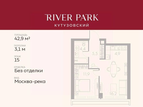 Продается 1-к квартира площадью 42.9 кв.м. на 15-м этаже в жилом комплексе премиум-класса River Park Кутузовский в Башне Lazur Tower О жилом комплексе. Премиальный жилой комплекс River Park Кутузовский строится в одном из самых престижных районов столицы Дорогомилово, на берегу Москвы-реки. Яркий проект в стиле эко-футуризма станет самым масштабным и самым высотным ЖК в локации Кутузовского проспекта. В проекте будет впервые воплощена концепция Family Premium. Расположение и Транспортная доступность: - На берегу Москвы-реки, напротив Москва-Сити - 600 метров до Кутузовского проспекта - Удобный съезд с ТТК - Прямой выезд на МКАД по Северному дублеру Кутузовского проспекта. - В пешей доступности 3 станции метро: Фили, Парк Победы, Кутузовская, а также станция МЦД Фили. Архитектура от именитого бюро ADM отличается уникальной пластикой фасадов - башни словно парят в воздухе, играя гранями как драгоценные камни. Жилой комплекс состоит из 5-ти небоскребов с home park на закрытой территории и внешней торговой галереей с открытым доступом. В закрытом внутреннем дворе уникальная по насыщенности клубная инфраструктура - 5 Towers Club только для жителей: - Многофункциональная спортивная площадка (баскетбол, футбол, воллейбол, большой теннис) - Детский игровой клуб NEMO - Life Rooms с караоке, барной стойкой и meeting room - Music salon - Gedonist Club с бильярдной - Beauty station - Гольф-симулятор Впервые в Москве lounge зоны на крыше небоскребов, только для жителей: - Всесезонные беседки иглу - Джакузи - Барная стойка - Грили - Площадка для занятий йогой - Самые высоки качели на крыше в России - Видовые площадки Благоустройство комплекса занимает 3 гектара и разработано мировым экспертом по городским парковым ландшафтам - голландским бюро WEST8. Концепция проекта дать жителям отдохнуть от городского ритма, расслабиться среди природы и натуральных материалов. В home park будут высажены многолетние деревья по принципу no allergy. - Зеркальный пруд с арт-объектом - Две детские площадки - Work out с навесом - Цветущий сад - Party lounge - Видовая зона отдыха с очагом - Солярий На территории жилого комплекса планируется строительство крупного образовательного центра: детский сад на 200 мест и школа на 460 мест. Продам 1-комнатную квартиру на проезде Кутузовский в Москве.