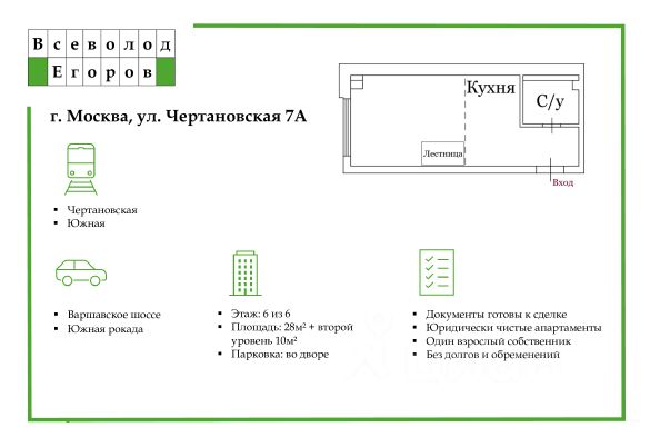 Номер лота: 100751. Тёплая, светлая 1-комнатная квартира с просторной кухней площадью 10 м². - Общая площадь - 35 м², жилая - 19.3 расположена на 6 этаже 12-этажного дома. - Окна на юго-восток, с видом на парк. - Можно заехать и жить! - В квартире в 2021 г. выполнен капитальный ремонт (стены выровнены, сантехнические коммуникации заменены на новые, окна заменены на пластиковые, межкомнатные двери новые, натяжной потолок, пол утеплён (комната ламинат, кухня линолеум)). - Санузел совмещённый, ванна новая чугунная. - Входная дверь качественная, основательная. Тамбур на три квартиры, уютный чистый, закрывается на ключ. Соседи порядочные. - Чистый подъезд, новый мусоропровод, новые почтовые ящики, своя наземная парковка для машин со шлагбаумом.. - Новые пассажирский, и грузовой лифты (заменены в 2025 г.). Дом находится рядом с уютным прудом (Нижний Афонинский пруд). Вечером можно безопасно гулять, заниматься спортом. На его территории есть детские и спортивные площадки, пешеходные и велодорожки, зона для выгула собак, пруд с пляжем. Инфраструктура: Развитая инфраструктура: парк, магазины, школы, детские сады, Дом творчества рядом с домом. Развитая транспортная доступность, до метро "Каховская" и "Севастопольская" 10 минут пешком. Остановка автобуса рядом с домом. Документы: Один взрослый собственник. 5 лет в собственности. Без обременений. Альтернатива подобрана. Оперативный показ. Быстрый выход на сделку. Причина продажи — переезд в другой район. Прекрасный вариант как для личного проживания, так и для инвестиций в аренду. Звоните и записывайтесь на просмотр, чтобы лично оценить все преимущества этой квартиры. Мы ждем Вас!