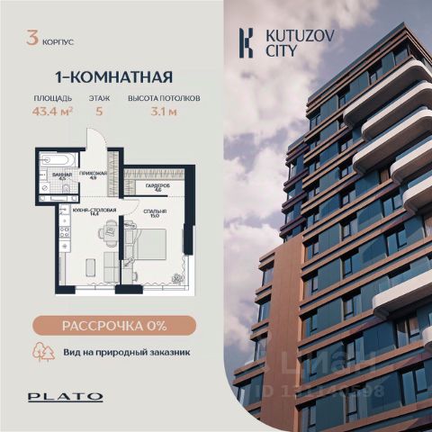 Продаётся светлая однокомнатная квартира площадью 47,4 м² в башне "Созидание" клубного дома "Кутузов Сити". Планировка квартиры продумана до мелочей и позволяет создать комфортное пространство для жизни. Просторная кухня-столовая с панорамными окнами объединяет обеденную зону, кухню и гостиную. Изолированная спальня обеспечивает уединённое пространство для отдыха. Здесь предусмотрена просторная угловая терраса, где можно устроить зону для отдыха на свежем воздухе. Для хранения вещей в спальне есть отдельная гардеробная, а также место в прихожей. Просторная ванная комната позволяет разместить как душевую кабину, так и большую ванную. Большие окна наполняют квартиру естественным светом и делают интерьер стильным. Высокие потолки придают пространству ощущение свободы и лёгкости. Продуманная планировка позволяет эффективно использовать каждый квадратный метр. О проекте: "Кутузов Сити" — клубный дом на 220 квартир, разработанный совместно с бюро Atrium и Oleg Klodt Architecture & Design. Проект строится в престижном Западном административном округе Москвы, всего в нескольких минутах ходьбы от Кутузовского проспекта. Закрытая территория, приватный двор, подземный паркинг и стильные лобби создают атмосферу комфорта и безопасности. В двух шагах от дома находится одна из крупнейших природных территорий Москвы — природный заказник "Долина реки Сетунь". Камерная застройка и развитая инфраструктура делают "Кутузов Сити" отличным выбором для тех, кто ценит качество жизни и близость к природе. (Лот: 164) Продам 1-комнатную квартиру рядом с метро Давыдково.