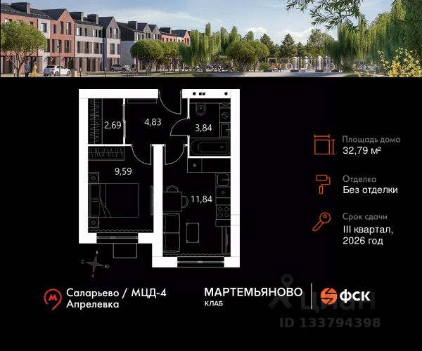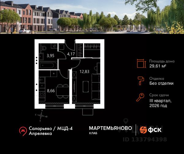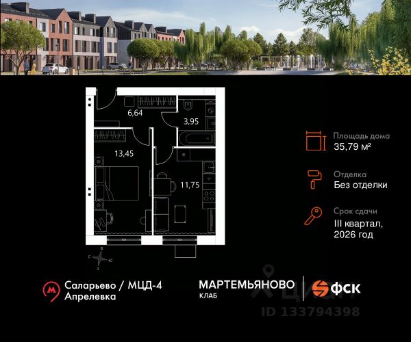 Прямая продажа от застройщика! Загородный жилой комплекс класса Комфорт Плюс. Продаётся 1-к квартира 103 общей площадью 28.1 кв.м на 5-м этаже 5 этажного дома. Без отделки. Расположение комплекса: "Апрелевка Клаб" это жилой комплекс всего в 30 км от Москвы по Киевскому шоссе, где городские удобства гармонично сочетаются с природой. Здесь начинается новая ступень жизни: современная малоэтажная застройка не нарушает живописные виды, а закрытая территория дарит чувство безопасности. Особенности проекта: - Улучшенная отделка МОПов - Социальная инфраструктура в шаговой доступности: муниципальные детский сад и школа, поликлиника - Не просто школа: школа МГИМО - Школа искусств МАРХИ - Всесезонное уникальное благоустройство: от города к природе через призму искусства - Комфортное пространство (спорт, досуг с детьми, работа в удаленном формате с прекрасными видами, место для творчества, тихие места для уединения и размышления) - Отличная транспортная доступность Транспортная доступность: - Метро Филатов Луг и Рассказовка 25 км - МЦД Апрелевка 5 км - МКАД — 30 км - Садовое кольцо — 45 км - Метро в Троицке (открытие в 2030) — 22 км - Ближайшая остановка общ. транспорта "Фрунзевец" 550 м - Ст. м. "Саларьево" 30 мин. на автобусе Внутренняя инфраструктура: Здесь есть хобби на любой вкус, возраст и сезон. Велосипедные, беговые и прогулочные маршруты, уличный workout, летний амфитеатр, спортивная площадка, центральная площадь с сухим фонтаном и игровыми зонами. Крытые развлечения: зона коворкинга, детская комната, кафе. В жилом комплексе будет современная школа на 830 мест и детский сад на 400 мест нового формата: с просторными классами и современным оснащением согласно высоким стандартам. Также на территории будет размещена школа искусств. Дворы без машин, игровые зоны и маршруты для прогулок с навигацией минимизируют риски и создают ощущение защищенности. Вдоль южной границы комплекса протекает река Десна, создавая зону отдыха в природном окружении.