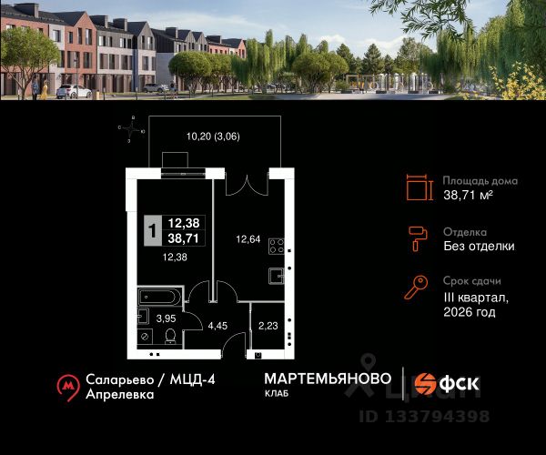 Прямая продажа от застройщика! Загородный жилой комплекс класса Комфорт Плюс. Продаётся 1-к квартира 103 общей площадью 28.1 кв.м на 5-м этаже 5 этажного дома. Без отделки. Расположение комплекса: "Апрелевка Клаб" это жилой комплекс всего в 30 км от Москвы по Киевскому шоссе, где городские удобства гармонично сочетаются с природой. Здесь начинается новая ступень жизни: современная малоэтажная застройка не нарушает живописные виды, а закрытая территория дарит чувство безопасности. Особенности проекта: - Улучшенная отделка МОПов - Социальная инфраструктура в шаговой доступности: муниципальные детский сад и школа, поликлиника - Не просто школа: школа МГИМО - Школа искусств МАРХИ - Всесезонное уникальное благоустройство: от города к природе через призму искусства - Комфортное пространство (спорт, досуг с детьми, работа в удаленном формате с прекрасными видами, место для творчества, тихие места для уединения и размышления) - Отличная транспортная доступность Транспортная доступность: - Метро Филатов Луг и Рассказовка 25 км - МЦД Апрелевка 5 км - МКАД — 30 км - Садовое кольцо — 45 км - Метро в Троицке (открытие в 2030) — 22 км - Ближайшая остановка общ. транспорта "Фрунзевец" 550 м - Ст. м. "Саларьево" 30 мин. на автобусе Внутренняя инфраструктура: Здесь есть хобби на любой вкус, возраст и сезон. Велосипедные, беговые и прогулочные маршруты, уличный workout, летний амфитеатр, спортивная площадка, центральная площадь с сухим фонтаном и игровыми зонами. Крытые развлечения: зона коворкинга, детская комната, кафе. В жилом комплексе будет современная школа на 830 мест и детский сад на 400 мест нового формата: с просторными классами и современным оснащением согласно высоким стандартам. Также на территории будет размещена школа искусств. Дворы без машин, игровые зоны и маршруты для прогулок с навигацией минимизируют риски и создают ощущение защищенности. Вдоль южной границы комплекса протекает река Десна, создавая зону отдыха в природном окружении.