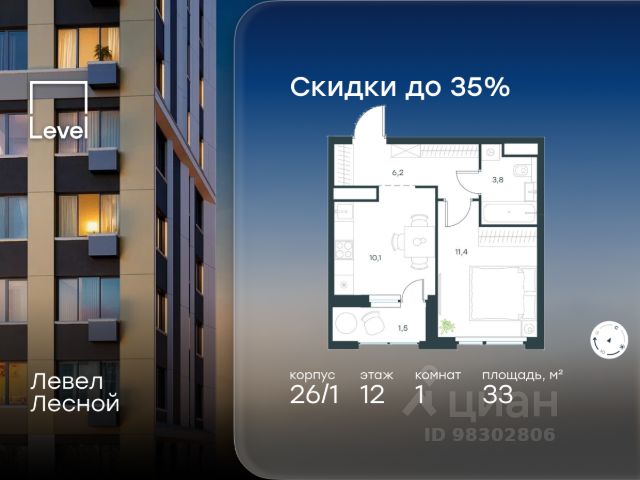 Цена указана с учётом скидки при 100%-й оплате, несубсидированной ипотеке, рассрочке (кроме программы "Рассрочка 0%"). В районе, утопающем в густой зелени лесов, многочисленных парков и скверов, продаётся 1-комнатная квартира площадью 33.60 кв.м с предчистовой отделкой. Квартира расположена на 2 этаже в жилом комплексе комфорт-класса Левел Лесной (компания Level Group/Левел групп). Отличная транспортная доступность: - 25 мин. пешком до станции метро "Пятницкое шоссе"; - 28 мин. на автобусе до станции метро и МЦД-2 "Волоколамская"; - 11 мин. на авто до МКАД; - 25 мин. на авто до ТТК. Продуманный архитектурный проект: - Концепция проекта Левел Лесной от бюро СПИЧ; - Высотность комплекса до 15 этажей с уникальными видами на лесные массивы и город; - Высота потолков до 3 м; - Современные окна высотой до 1,6 м, в части квартир предусмотрены окна в пол. Высота подоконников 0,6 м; Расположение: Жилой комплекс Левел Лесной строится в зелёной зоне ближайшего Подмосковья, г.о. Красногорск в посёлке Отрадное. Шаговая и автомобильная доступность до метро и больших транспортных артерий города. За 25 минут вы дойдёте до станции метро "Пятницкое шоссе", а за 20 минут на машине сможете доехать до станции метро "Тушинская". Район окружен роскошной зеленью лесов и парковых зон, занимающих территорию свыше 1 000 гектаров. Помимо благоприятной экологии, здесь множество возможностей для активного отдыха и поддержания физической формы. Облагороженная территории с полностью развитой инфраструктурой. На территории проекта находится детский сад и школа "Светлые Горы", которая входит в список лучших частных школ от Forbes Education (по данным на 2023г.). Кроме того, в пешей доступности расположено ещё 8 детских садов, а также запланировано открытие современной муниципальной школы. В непосредственной близости находятся сетевые супермаркеты и локальные магазины, аптеки, клиники, почта, библиотека, салоны красоты, рестораны, спортивные и творческие секции, развивающие детские центры. В 12 минутах пешком расположен торговый парк "Отрада" с продуктовым и строительным гипермаркетами, магазинами, кинотеатром и развлечениями для детей. Внутренняя инфраструктура: Мы знаем, как важно, чтобы магазины и сервисы были всегда рядом. В сданных корпусах жилого комплекса Левел Лесной уже расположена полностью готовая развитая инфраструктура. На первых этажах корпуса 27 предусмотрено ещё 14 коммерческих помещений. Благоустройство: Продуманное пространство и аура приватного европейского городка рождают чувство лёгкости и расслабления у каждого, кто попадает на территорию проекта. Концепцию общественных площадок разработали в партнёрстве два архитектурных бюро: "Хайлайт Архитектура" (Highlight Architecture) и "Скейп" (Scape). В безопасных дворах без машин каждый обязательно найдёт себе место для вдохновения, отдыха и спорта.