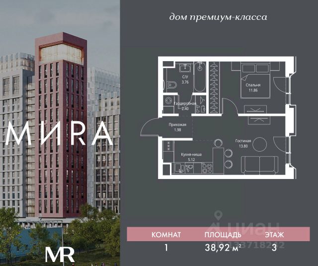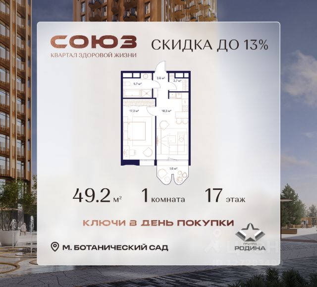 Прямая продажа от застройщика. Продаётся 1-комнатная квартира общей площадью 35.76 м² без отделки в доме премиум-класса МИRА на 2-м этаже 24 этажного дома. Квартира расположена в корпусе 3. Дом премиум-класса МИRA это: • Спокойный район с богатой историей и сложившейся инфраструктурой • Авторская архитектура на стыке классики и современности • Вход в парк прямо из жилого комплекса • Панорамные виды на Яузу, парки, ВДНХ и скульптуру "Рабочий и колхозница" • Удобные сервисы и безопасность для каждого резидента Расположение: Жилой квартал расположен в Алексеевском районе на северо-востоке Москвы, на второй линии домов, таким образом вы сможете дистанцироваться от шума и суеты проспекта Мира, но при этом будете жить недалеко от этой важной городской магистрали. Прямо у дома: • Парк Акведук • Река Яуза • Памятник "Рабочий и колхозница" Пешком: • 16 мин м. ВДНХ На автомобиле: • 12 мин ТТК • 15 мин Садовое кольцо • 12 мин Национальный парк "Лосиный остров" Благоустройство: Концепция благоустройства от бюро "ДРУЖБА" разработана в стиле "Лесная тропа". В уютном дворе расположились словно затерянные в лесу, площадки для отдыха. Они разделяются островками с травами, кустарниками, крупными камнями и деревьями, между которыми проходят узкие песчаные тропинки с деликатной подсветкой по вечерам. Центральной точкой притяжения для жителей станет главная площадь с фонтаном, которая открывается сразу из двух входных групп. Внутренний двор МИRA: • Детская площадка с зонами для игр малышей до трех лет и детей более старшего возраста • Спортивная площадка с профессиональным оборудованием для тренировок • Декоративные перголы • Воздушный арт-объект с подсветкой, похожий на облако • Чайный домик, где в отдельном отапливаемом павильоне можно в любое время года попить кофе с соседями или устроить камерное семейное чаепитие • Зоны для работы и отдыха с гамаком под навесом, скамейками и креслами Инфраструктура и окружение: В Алексеевском районе есть огромные благоустроенные парки, магазины, гимназии с высоким рейтингом и филиалы ВУЗов, частные и государственные детские сады, модные кофейни и фитнес-центры. В квартале МИRА предусмотрены: • 2 ресторана с видом на парк Акведук • 3 кафе • фитнес-студия • подземный паркинг на 330 машино-мест Компания MR Group предлагает своим клиентам специальные условия приобретения квартир в рамках программ ипотечного кредитования от банков-партнеров. Продам 1-комнатную квартиру рядом с метро ВДНХ.