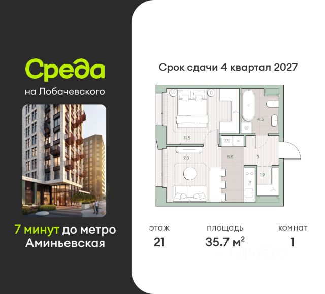 О квартире Продаётся 1-комнатная квартира общей площадью 35.8 кв.м. без отделки. Квартира расположена на 13 этаже корпуса 5.7 в жилом комплексе бизнес-класса "Среда на Лобачевского" в пешей доступности от метро "Аминьевская". О жилом комплексе "Среда на Лобачевского" полностью соответствует критериям современного жилого пространства. Взяв за основу рациональный подход, мы гармонично соединили дизайн, актуальные тренды и функциональность. Продуманный современный экстерьер и функциональные планировки внутри, приватные пространства и разнообразные досуговые зоны для каждого члена семьи — все это "Среда на Лобачевского". Инфраструктура Район отлично развит и наполнен жизнью, здесь уже есть вся необходимая инфраструктура — детские сады, школы, медучреждения, торговые центры, благоустроены парки для прогулок и отдыха, удобен и легкодоступен городской транспорт. Рядом расположены учебные корпуса крупных университетов — МГУ, МГИМО и РАНХиГС. Школы и детские сады в районе занимают высокие позиции в городских рейтингах, поэтому вам не придется беспокоиться о качестве образования детей. Как и об отдыхе: поблизости расположены живописные пруды, реки и парки. Это Парк Олимпийской деревни, Парк имени 50-летия Октября, Мещерский парк и Очаковские пруды. Теперь поставить галочки в еженедельном чек-листе "спорт-прогулки-встречи с друзьями" можно, не покидая любимый район. Особенности Особое внимание в проекте уделяется созданию функциональных пространств не только внутри дома, но и за его пределами. В ландшафтном парке "Среды на Лобачевского" расположены крытые зоны для спокойного времяпровождения, места для активного отдыха и спорта, коворкинг, соседский комьюнити-центр, водные объекты. —Ландшафтный парк во дворе. —Водный сад с зонами отдыха. —Зоны коворкинга. —Дизайнерские гранд-лобби. —Бесключевой доступ. —Подземный паркинг.