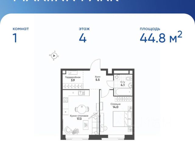 Продается квартира 22, по адресу г. Москва, ул. Октябрьская 103, корпус MariInn Park в Mariinn Park на 4 этаже, с площадью 44.8 м2.