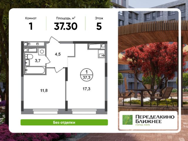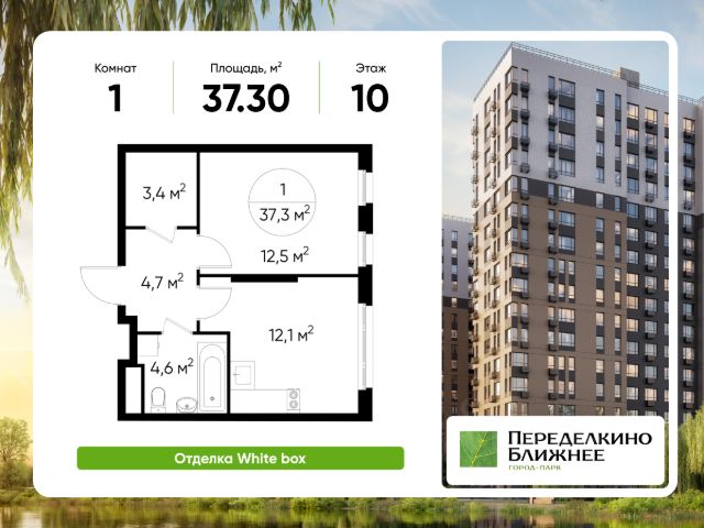 Продается однокомнатная квартира в городе-парке "Переделкино Ближнее". Общая площадь квартиры - 41,4 кв. м, этаж 12 из 17. Срок сдачи - 3 квартал 2028 года. Тип дома - монолитный. Корпус расположен в новой 13 фазе строительства и состоит из 6 секций с переменной этажностью 12-17 этажей. Все секции с отделкой White Box с возможностью повышения за дополнительную плату до дизайнерской отделки: Classic или Smart+ Около 13 фазы запланировано строительство многоуровневого паркинга на 300 м/мест. 13 фаза имеет уникальное расположение и находится непосредственно на берегу Федосьинского пруда, который является сердцем города-парка "Переделкино Ближнее". Город-парк "Переделкино Ближнее" расположен в 8 км от МКАД по Боровскому шоссе. ТРАНСПОРТНАЯ ДОСТУПНОСТЬ: - 15 минут пешком до станции МЦД-4 "Мичуринец" - 25 минут пешком до станции метро "Рассказовка" Солнцевской линии - 30 минут до центра Москвы - 2026 г. - открытие трассы Солнцево-Бутово-Варшавское шоссе РАЗВИТАЯ СОЦИАЛЬНАЯ ИНФРАСТРУКТУРА: - 7 детских садов, 3 школы - банки, продуктовые магазины, аптеки, фитнес центры, салоны красоты и пр БЛАГОУСТРОЙСТВО: - дворы без машин - игровые зоны и развивающие детские площадки - зоны для созерцательного и медитативного отдыха - зоны для занятий спортом ОСОБЕННОСТИ АРХИТЕКТУРЫ: - высокие потолки от 3,03 м - безбарьерные входные группы - колясочные в каждой входной группе - кладовые помещения расположены на -1 этаже каждой секции - в каждой секции 2 лифта: 1 пассажирский, 1 грузовой - на фасаде предусмотрены корзины для установки кондиционеров АВТОРСКИЙ ДИЗАЙН: Входные группы выполнены по авторскому дизайну, благодаря панорамному остеклению наполнены естественным светом. В каждой входной группе будет располагаться комфортабельная зона ожидания с возможностью зарядить электронные устройства, почтовые ящики, колясочная, акцентные пуфы и столик.