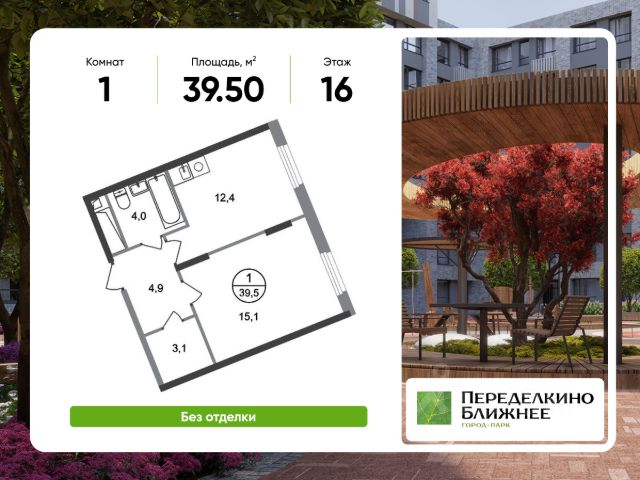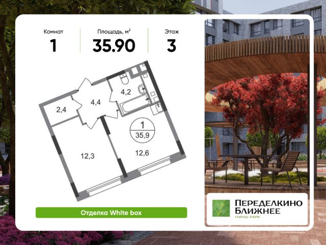 Продается однокомнатная квартира в городе-парке "Переделкино Ближнее". Общая площадь квартиры - 34,9 кв. м, этаж 4 из 17. Срок сдачи - 3 квартал 2026 года. Тип дома - монолитный. Город-парк "Переделкино Ближнее" расположен в 8 км от МКАД по Боровскому шоссе. ТРАНСПОРТНАЯ ДОСТУПНОСТЬ: - 10 минут пешком до МЦД-4 "Мичуринец" - 15 минут пешком до станции метро "Рассказовка" Солнцевской линии - 10 минут на машине до станции метро "Филатов Луг" Сокольнической линии - 30 минут до центра Москвы - Прямой выезд на дорогу Солнцево-Бутово-Варшавское шоссе, минуя жилую застройку всего ЖК БЛАГОУСТРОЙСТВО: Новая фаза строительства уникальна своим расположением - в шаговой доступности парк на Лукинской улицы, река Алёшинка. На территории 18 фазы строительства будут построены 2 монолитных жилых корпуса повышенного комфорта разной этажности 7, 17 этажей. А также многоуровневый паркинг на 300 м/мест. Вход в жилую часть корпусов каждой секции осуществляется с двух сторон - с наружного контура жилого дома и со стороны дворового пространства, предусмотрен безбарьерный доступ. ВНУТРЕННЯЯ ИНФРАСТРУКТУРА: В рамках данной фазы, для жителей предусмотрено создание пространства, свободного от машин - благоустроенные огороженные дворы с современными детскими и спортивными площадками, разделенными на зоны по возрастам. На территории проекта есть все необходимые объекты социальной и бытовой инфраструктуры: детские сады, школы, магазины, паркинги, аптеки, поликлиники, пожарная часть и др. АВТОРСКИЙ ДИЗАЙН: Современный монолитный дом переменной этажности 7 и 17 этажей. На фасаде предусмотрены корзины для установки кондиционеров. Входные группы домов выполнены по авторскому дизайну. Колясочные располагаются при входе, велопарковка на -1 этаже.