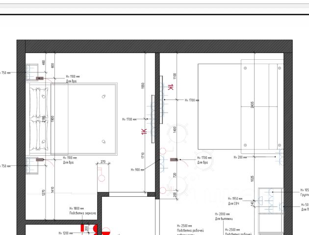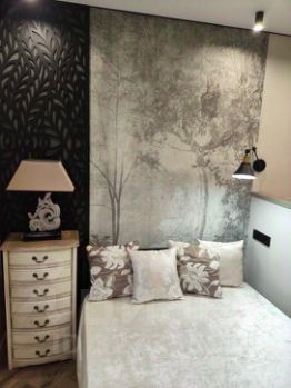 В спальне: кровать с подъемным механизмом и ортопедическим матрасом, прикроватная банкетка с хранением, деревянные панели, бра, зеркала в металлической оправе, дизайнерские обои Loymina.