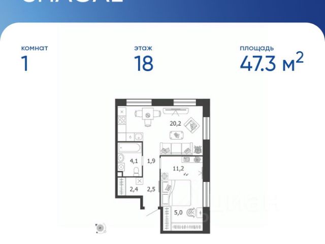 Продается квартира 378, по адресу г. Москва, ЮАО, Даниловский, ул. Автозаводская, вл. 23/75, корпус Жилой квартал Shagal, 3 очередь, 5 этап, корпус 6 в Shagal на 18 этаже, с площадью 47.3 м2.
