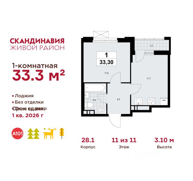 Продается однокомнатная квартира 209 в новостройке Жилой район "Скандинавия" по адресу Москва, ТиНАО, Новомосковский АО, Сосенское С/П, Коммунарка пос., жилой комплекс Скандинавия, 28.1, район Коммунарка, Новомосковский административный округ, Москва. Общая площадь квартиры - 33.50 кв. м., этаж 10 из 11, секция 3. Тип проекта, по которому построен дом - монолит, компания-застройщик - ООО "А101". Стоимость квартиры - 16327230 Р. ПРЕДЛОЖЕНИЯ ОТ ЗАСТРОЙЩИКА В ФЕВРАЛЕ 2026: Скидки до 10% на все квартиры. Только в офисах продаж до 28 февраля. Ипотека от 13,9 % для всех! На весь срок. "Семейная ипотека" вернулась. Ставка от 3,5 % на весь срок! Без удорожания! Выгодное ипотечное комбо: Ипотека от 2200 р./мес. и от 6 % после рождения ребёнка! Ипотека для всех "Держи пять!" - ставка 5 % на 2 года! *более подробную информацию по скидкам и акциям уточняйте в отделе продаж ЖК "Скандинавия" на границе Бутовского лесопарка (1610 га) - это баланс качественного жилья и сервисов, зелёных пространств для активного и созерцательного отдыха. Выразительная архитектура и цветовая гамма монолитных корпусов комфорт- и бизнес-класса (8-17 этажей) созвучны скандинавским мотивам, органично интегрированы в великолепный природный контекст. Огороженные дворы свободны от машин, в них продуманы места для отдыха и работы на свежем воздухе, озеленение, детские и спортивные площадки. Для прогулок, встреч и районных праздников - площадь Туве Янссон с "сухим" фонтаном, вековыми дубами и единственным в мире памятником писательнице; пешеходный променад 2 км; 3 крупных природных ручья; более 15 км велосипедных и прогулочных дорожек с арт-объектами. Инфраструктура района включает современные школы и детские сады, центр впечатлений, фитнес-клубы, развивающие и творческие центры, магазины, кафе, салоны красоты. На подземных этажах - паркинги и кладовые. Преимущества "Скандинавии": - ст. метро "Потапово" - 100 м от ближайших домов (открыта!) - удобные выезды на трассу Солнцево - Бутово - Варшавское шоссе и ул. Бачуринская - свои школы и детские сады - инфраструктура на первых этажах и рядом с домом - лесопарк, природные водоёмы, прогулочные маршруты