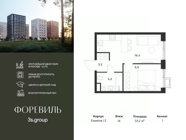 Предчистовая отделка в подарок! Пешая доступность от метро и московская прописка! Продается уютная 1-комн. квартира площадью 38,8 кв.м на 9 этаже 17 этажного жилого комплекса бизнес-класса Foreville от 3S Group. Общая площадь: 38,8 кв.м., жилая: 10,7 кв.м., площадь кухни-гостиной: 20,1 кв.м., высота потолков: 2,72 м., окна выходят во двор. Квартира предлагается без отделки, что идеально подходит для воплощения собственного дизайнерского решения. Также доступна опция предчистовой отделки, стоимость которой включается в общую цену квартиры. О проекте: Пространство Комплекс располагает крупнейшим приватным двор-парком в Новой Москве площадью 1,2 Га, предлагая жителям огромное пространство для отдыха, спорта и игр на свежем воздухе. Природный ландшафт Внутренний лесопарк с более чем 183 взрослыми деревьями и 10 320 цветущими кустарниками создает уникальную природную атмосферу для каждого времени года. Игровые и спортивные зоны Обширные площадки с безопасным покрытием, специализированные зоны для детей разных возрастных групп и взрослых, включая воркаут и настольный теннис, способствуют активному и здоровому образу жизни. Экологичность и долговечность Использование натуральных материалов, таких как лиственница, и крупноформатной бетонной плитки для покрытия, подчеркивает стремление проекта к экологичности и устойчивости. Безопасность и уединение Внутренний двор без машин обеспечивает безопасность для детей и спокойствие для взрослых. Территория огорожена и находится под круглосуточным видеонаблюдением. Сохранение времени Благодаря превосходной транспортной доступности и близости к новой станции метро Корниловская, Foreville позволяет жителям экономить время для семьи и отдыха на природе, минимизируя необходимость длительных поездок. Foreville не просто жилье, а целая экосистема для комфортной и гармоничной жизни на свежем воздухе, совмещая преимущества городской инфраструктуры и непосредственную близость к природе.