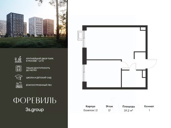 Предчистовая отделка в подарок! Пешая доступность от метро и московская прописка! Продается уютная 1-комн. квартира площадью 40,8 кв.м на 1 этаже 17 этажного жилого комплекса бизнес-класса Foreville от 3S Group. Общая площадь: 40,8 кв.м., жилая: 22,3 кв.м., площадь кухни-гостиной: 18,2 кв.м., высота потолков: 4,22 м., окна выходят во двор. Квартира предлагается без отделки, что идеально подходит для воплощения собственного дизайнерского решения. Также доступна опция предчистовой отделки, стоимость которой включается в общую цену квартиры. О проекте: Пространство Комплекс располагает крупнейшим приватным двор-парком в Новой Москве площадью 1,2 Га, предлагая жителям огромное пространство для отдыха, спорта и игр на свежем воздухе. Природный ландшафт Внутренний лесопарк с более чем 183 взрослыми деревьями и 10 320 цветущими кустарниками создает уникальную природную атмосферу для каждого времени года. Игровые и спортивные зоны Обширные площадки с безопасным покрытием, специализированные зоны для детей разных возрастных групп и взрослых, включая воркаут и настольный теннис, способствуют активному и здоровому образу жизни. Экологичность и долговечность Использование натуральных материалов, таких как лиственница, и крупноформатной бетонной плитки для покрытия, подчеркивает стремление проекта к экологичности и устойчивости. Безопасность и уединение Внутренний двор без машин обеспечивает безопасность для детей и спокойствие для взрослых. Территория огорожена и находится под круглосуточным видеонаблюдением. Сохранение времени Благодаря превосходной транспортной доступности и близости к новой станции метро Корниловская, Foreville позволяет жителям экономить время для семьи и отдыха на природе, минимизируя необходимость длительных поездок. Foreville не просто жилье, а целая экосистема для комфортной и гармоничной жизни на свежем воздухе, совмещая преимущества городской инфраструктуры и непосредственную близость к природе.