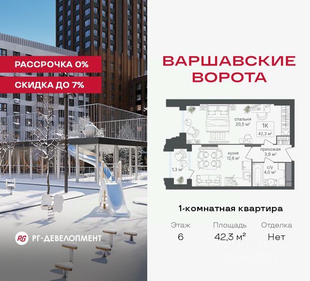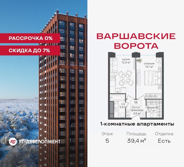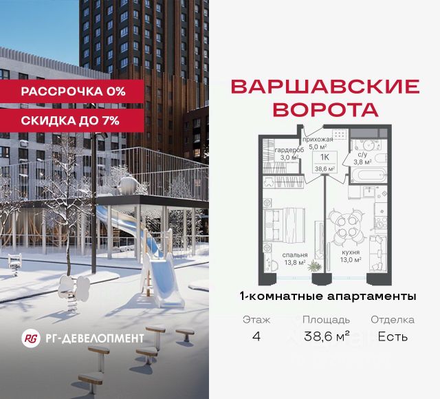 Рассрочка 0% + скидка 5%. Первый платёж 50% при ДДУ, второй 50% — через 12 мес. до ввода ЖК. Продаются 1-комнатные апартаменты 39,4 кв.м. в МФК "Варшавские ворота" на 3-м этаже 9 этажного дома. МФК "Варшавские ворота" — это проект, в котором учтен широкий спектр требований: от транспортной доступности и развитой инфраструктуры до архитектурной выразительности и экологического окружения. Апартаменты в МФК "Варшавские ворота" подойдут для тех, кто ищет продуманное жилье в Москве или готовый инвестиционный актив. Апартаменты здесь — это: - возможность жить комфортно в удобном городском формате — с природой, метро, сервисом и паркингом; - возможность купить лот с готовой отделкой, чтобы вложить минимальные инвестиции в ремонт и получить максимум возможностей от сдачи; - экономия на налоге на имущество, кадастровая стоимость апартаментов ниже ~ на 30% кадастровой стоимости квартиры; - высокая инвестиционная доходность объекта за счет более низкой цены покупки по сравнению с квартирой. Коротко о важном: - 1 минута пешком от м. Аннино; - Удобные выезды на Варшавское шоссе и МКАД; - Вид из окон на Битцевский лес и Аннинский лесопарк; - Высота потолков 2,7 - 3 м; - Закрытый двор-парк; - Школы и детские сады в 10-15 минутах пешком от дома; - Технические лоджии для размещения кондиционеров; - Подземный паркинг; - РГ-Девелопмент — ТОП-20 крупнейших застройщиков России. Проект сочетает в себе современную архитектуру и продуманное благоустройство с уникальным природным окружением. Всего в нескольких минутах от дома — девять парков, каскад прудов и крупнейшие лесопарковые зоны Москвы, создающие ощущение жизни в зеленом оазисе посреди мегаполиса. Архитектурная концепция - стиль Чикаго в Москве. Выполнена в минималистичной эстетике с использованием клинкера и декоративного кирпича. Фасады подчеркивают строгие линии и современный стиль, а входные группы разработаны московским бюро Syntaxis. Лобби оформлены с применением керамогранита, декоративной штукатурки и гипсовых панелей, детали из латуни добавляют изысканности. Пространство оживляют гербарии, композиции из сухоцветов и авторские панно. Проект находится в одной минуте пешком от метро "Аннино", в 12 минутах от станции "Улица Академика Янгеля" и рядом с МЦД-2 "Красный Строитель". Для автомобилистов предусмотрен прямой выезд на Варшавское шоссе и два съезда на МКАД, что позволяет быстро добираться в любую часть города. Среди планировочных решений представлены разнообразные форматы: от функциональных студий до просторных 4-комнатных квартир и апартаментов площадью от 22 до 105 м². Высокие потолки усиливают ощущение простора, а продуманные планировки включают мастер-спальни, гардеробные, угловые окна, объединённые кухни-гостиные и несколько санузлов. Центральное пространство комплекса — закрытый двор без машин. Он разделён на функциональные зоны: детские игровые комплексы, спортивные площадки, воркаут-зоны и уютные места для тихого отдыха. На первых этажах разместя 1-комнатная квартира на шоссе Варшавское в Москве.