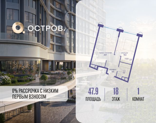 Продаётся однокомнатная квартира от застройщика: общая площадь 47.30 м², жилая 13.10 м², кухня 21.30 м², 19, жилой квартал "Остров 7", корпус 7 (7 квартал) (секция 2). срок сдачи: 4-кв. 2025. , 1 совмещенный санузел. В жилой зоне 2 больших окна на одну сторону, хорошая инсоляция. Позвоните сейчас и забронируйте квартиру! Купите квартиру в доме у прибрежного парка, в квартале ОСТРОВ.7. Это семь корпусов премиум- и бизнес-класса в одном из лучших мест ОСТРОВА - между бульваром и парком, поблизости от реки. Стильные корпуса имеют узнаваемый вид благодаря бионической пластике фасадов, приподнятых над землей. Для жителей предусмотрены детский клуб, фитнес-рум, коворкинг, переговорные, лаунжи. На крышах устроены видовые общественные пространства с зонами для отдыха и спорта. Двор расположен на двух уровнях: нижний ландшафтный парк и верхняя городская терраса. ОСТРОВ.7 - часть жилого комплекса на западе Москвы, в 15 минутах езды от центра. Это настоящий заповедник посреди большого города, в окружении реки и 650 га заповедников. Здесь все необходимое находится по соседству: от детского сада до супермаркета, от фитнес-зала до серфинг-центра. На территории созданы все условия для отдыха и общения: клубная инфраструктура в домах и дворы-парки, набережные и променады, маршруты для спортсменов, детей и возрастных жителей. В нескольких минутах ходьбы расположена станция метро "Терехово" БКЛ. На автомобиле - 10 минут до Москва-Сити и 15 минут до Садового кольца.