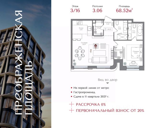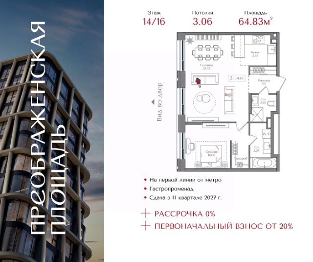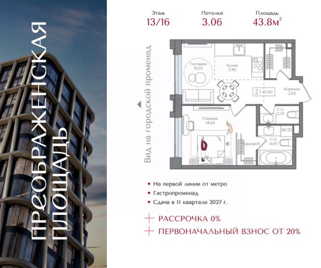 Рассрочка 0% с первоначальным взносом от 20% Квартира на 13 этаже в жилом комплексе премиум-класса "Преображенская площадь". Общая площадь: 37.8 кв.м. Проект премиум-класса в историческом районе Москвы. До метро "Преображенская площадь" 3 минуты пешком. Квартиры сдаются без отделки и в свободной планировке, чтобы жители могли оформить пространство с учетом своей индивидуальности. Высота потолков от 3,15м, широкоформатное остекление, 3-5 квартир на этаже. Система Умный дом. Дизайнерские лобби. Внутренний двор 1,5 га функциональное и безопасное пространство для игр, работы и занятий спортом. Пешеходный променад для прогулок. Дома переменной этажности. Есть подземный паркинг. Жилой комлекс находится в окружении парков Сокольники, Черкизовский, Измайловский, заповедника Лосиный остров и ВДНХ, а также вблизи пешеходной набережной. Комфортная удаленность от центра: 7 минут на автомобиле до ТТК, 8 минут до Садового кольца, 25 минут до Кремля.