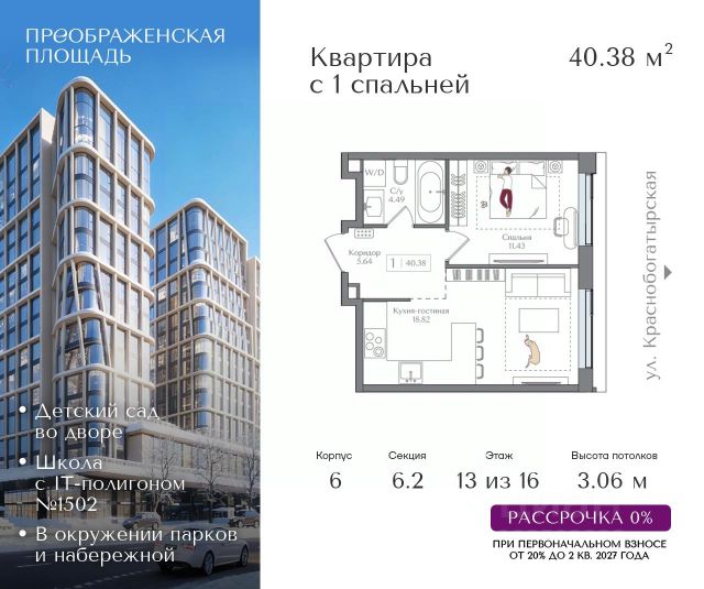 Квартира на 3 этаже в жилом комплексе премиум-класса "Преображенская площадь". Общая площадь: 45.12 кв.м. Проект премиум-класса в историческом районе Москвы. До метро "Преображенская площадь" 3 минуты пешком. Квартиры сдаются без отделки и в свободной планировке, чтобы жители могли оформить пространство с учетом своей индивидуальности. Высота потолков от 3,15м, широкоформатное остекление, 3-5 квартир на этаже. Система Умный дом. Дизайнерские лобби. Внутренний двор 1,5 га функциональное и безопасное пространство для игр, работы и занятий спортом. Пешеходный променад для прогулок. Дома переменной этажности. Есть подземный паркинг. Жилой комлекс находится в окружении парков Сокольники, Черкизовский, Измайловский, заповедника Лосиный остров и ВДНХ, а также вблизи пешеходной набережной. Комфортная удаленность от центра: 7 минут на автомобиле до ТТК, 8 минут до Садового кольца, 25 минут до Кремля.
