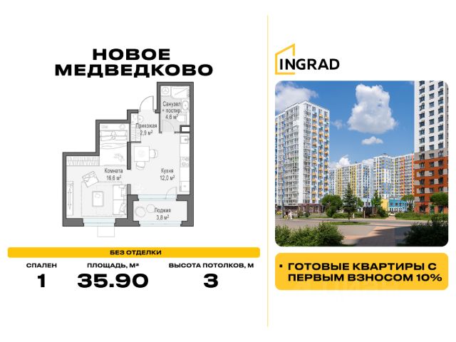 Прямая продажа от девелопера. В жилом квартале, расположенном в северо-западной части города Мытищи, продаётся 1-спальная квартира площадью 35.90 кв.м без отделки. Квартира расположена на 18 этаже 18-этажного дома, корпус 43, в жилом квартале комфорт-класса "Новое Медведково" (девелопер Ingrad). Расположение: Мытищи - один из ближайших спутников столицы, расположенный в живописной локации на северо-востоке Московской области в окружении лесопарков, водохранилищ и озер. Уровень развития социальной, торговой и культурной инфраструктуры города приближает его к Москве, но за счёт компактности самих Мытищ делает ещё удобнее. Отличная транспортная доступность: "Новое Медведково" возводится в северо-западной части города Мытищи в Микрорайоне 17А, всего в 6 км от МКАД, вблизи остановок общественного транспорта и в непосредственной близости от Пироговского лесопарка (400 м). 28 корпусов уже введены в эксплуатацию. Путь до Москвы по Волковскому шоссе составляет не более 10 минут. Добраться можно также на электричке - 20 минут по Ярославскому направлению до станции "Ядреево", на автобусе или маршрутке до станции метро "Медведково" менее, чем за полчаса. Инфраструктура: Комплексное развитие территории проекта "Новое Медведково" предполагает строительство полной собственной инфраструктуры одновременно с возведением жилых домов, которая будет включать в себя: Лингвистическую гимназию с 4 иностранными языками на 768 учеников (уже построена и работает), 5 детских садов общей емкостью 1 060 мест (два детский сада на 400 малышей построены и работают), Школу общей емкостью 1 735 мест, медицинский центр, Спортивный комплекс и многоуровневые парковки. Помещения под коммерческую инфраструктуру на первых (нежилых) этажах домов уже арендованы собственниками бизнеса: аптеки, магазины, супер- и минимаркеты, точки бытового и сервисного обслуживания, салоны красоты, пекарни, кондитерские, развивающие студии для детей.