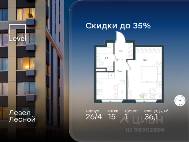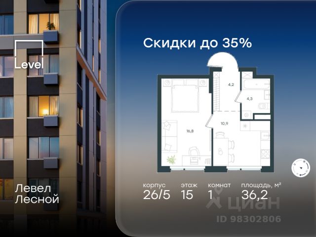 Цена указана с учётом скидки при 100%-й оплате, несубсидированной ипотеке, рассрочке (кроме программы "Рассрочка 0%"). В районе, утопающем в густой зелени лесов, многочисленных парков и скверов, продаётся 1-комнатная квартира площадью 36.20 кв.м с отделкой white box. Квартира расположена на 15 этаже в жилом комплексе комфорт-класса Левел Лесной (компания Level Group/Левел групп). Отличная транспортная доступность: - 25 мин. пешком до станции метро "Пятницкое шоссе"; - 28 мин. на автобусе до станции метро и МЦД-2 "Волоколамская"; - 11 мин. на авто до МКАД; - 25 мин. на авто до ТТК. Продуманный архитектурный проект: - Концепция проекта Левел Лесной от бюро СПИЧ; - Высотность комплекса до 15 этажей с уникальными видами на лесные массивы и город; - Высота потолков до 3 м; - Современные окна высотой до 1,6 м, в части квартир предусмотрены окна в пол. Высота подоконников 0,6 м; Расположение: Жилой комплекс Левел Лесной строится в зелёной зоне ближайшего Подмосковья, г.о. Красногорск в посёлке Отрадное. Шаговая и автомобильная доступность до метро и больших транспортных артерий города. За 25 минут вы дойдёте до станции метро "Пятницкое шоссе", а за 20 минут на машине сможете доехать до станции метро "Тушинская". Район окружен роскошной зеленью лесов и парковых зон, занимающих территорию свыше 1 000 гектаров. Помимо благоприятной экологии, здесь множество возможностей для активного отдыха и поддержания физической формы. Облагороженная территории с полностью развитой инфраструктурой. На территории проекта находится детский сад и школа "Светлые Горы", которая входит в список лучших частных школ от Forbes Education (по данным на 2023г.). Кроме того, в пешей доступности расположено ещё 8 детских садов, а также запланировано открытие современной муниципальной школы. В непосредственной близости находятся сетевые супермаркеты и локальные магазины, аптеки, клиники, почта, библиотека, салоны красоты, рестораны, спортивные и творческие секции, развивающие детские центры. В 12 минутах пешком расположен торговый парк "Отрада" с продуктовым и строительным гипермаркетами, магазинами, кинотеатром и развлечениями для детей. Внутренняя инфраструктура: Мы знаем, как важно, чтобы магазины и сервисы были всегда рядом. В сданных корпусах жилого комплекса Левел Лесной уже расположена полностью готовая развитая инфраструктура. На первых этажах корпуса 27 предусмотрено ещё 14 коммерческих помещений. Благоустройство: Продуманное пространство и аура приватного европейского городка рождают чувство лёгкости и расслабления у каждого, кто попадает на территорию проекта. Концепцию общественных площадок разработали в партнёрстве два архитектурных бюро: "Хайлайт Архитектура" (Highlight Architecture) и "Скейп" (Scape). В безопасных дворах без машин каждый обязательно найдёт себе место для вдохновения, отдыха и спорта.