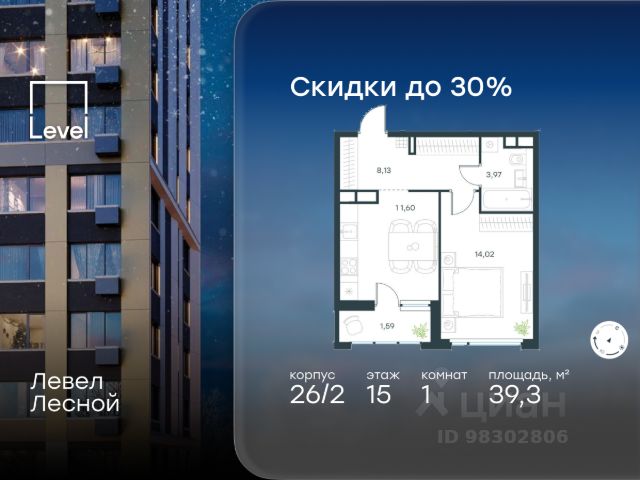 Цена указана с учётом скидки при 100%-й оплате, несубсидированной ипотеке, рассрочке (кроме программы "Рассрочка 0%"). В районе, утопающем в густой зелени лесов, многочисленных парков и скверов, продаётся 1-комнатная квартира площадью 31.60 кв.м с отделкой white box. Квартира расположена на 15 этаже в жилом комплексе комфорт-класса Левел Лесной (компания Level Group/Левел групп). Отличная транспортная доступность: - 25 мин. пешком до станции метро "Пятницкое шоссе"; - 28 мин. на автобусе до станции метро и МЦД-2 "Волоколамская"; - 11 мин. на авто до МКАД; - 25 мин. на авто до ТТК. Продуманный архитектурный проект: - Концепция проекта Левел Лесной от бюро СПИЧ; - Высотность комплекса до 15 этажей с уникальными видами на лесные массивы и город; - Высота потолков до 3 м; - Современные окна высотой до 1,6 м, в части квартир предусмотрены окна в пол. Высота подоконников 0,6 м; Расположение: Левел Лесной строится в зелёной зоне ближайшего Подмосковья, г.о. Красногорск в посёлке Отрадное. Шаговая и автомобильная доступность до метро и больших транспортных артерий города. За 25 минут вы дойдёте до станции метро "Пятницкое шоссе", а за 20 минут на машине сможете доехать до станции метро "Тушинская". Район окружен роскошной зеленью лесов и парковых зон, занимающих территорию свыше 1 000 гектаров. Помимо благоприятной экологии, здесь множество возможностей для активного отдыха и поддержания физической формы. Облагороженная территории с полностью развитой инфраструктурой. На территории проекта находится детский сад и школа "Светлые Горы", которая входит в список лучших частных школ от Forbes Education (по данным на 2023г.). Кроме того, в пешей доступности расположено ещё 8 детских садов, а также запланировано открытие современной муниципальной школы. В непосредственной близости находятся сетевые супермаркеты и локальные магазины, аптеки, клиники, почта, библиотека, салоны красоты, рестораны, спортивные и творческие секции, развивающие детские центры. В 12 минутах пешком расположен торговый парк "Отрада" с продуктовым и строительным гипермаркетами, магазинами, кинотеатром и развлечениями для детей. Внутренняя инфраструктура: Мы знаем, как важно, чтобы магазины и сервисы были всегда рядом. В сданных корпусах Левел Лесной уже расположена полностью готовая развитая инфраструктура. На первых этажах корпуса 27 предусмотрено ещё 14 коммерческих помещений. Благоустройство: Продуманное пространство и аура приватного европейского городка рождают чувство лёгкости и расслабления у каждого, кто попадает на территорию проекта. Концепцию общественных площадок разработали в партнёрстве два архитектурных бюро: Highlight Architecture и SCAPE. В безопасных дворах без машин каждый обязательно найдёт себе место для вдохновения, отдыха и спорта.