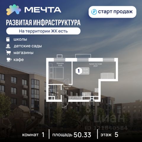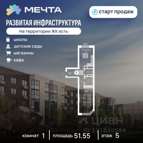 СТАРТ ПРОДАЖ! Рассрочка 0% от застройщика! Продается однокомнатная квартира в квартале "Любовь" жилого комплекса "Мечта". Общая площадь квартиры: 44.90 кв. м, этаж 5 из 5. Заселение: 2 квартал 2028 г. Отделка: Чернова ОСОБЕННОСТИ: - Просторная кухня-гостиная - Большая прихожая - Балкон - Высота потолка: 2.7 метра Жилой комплекс "Мечта" расположен в 23 км от МКАД по Дмитровскому или Ленинградскому шоссе. ТРАНСПОРТНАЯ ДОСТУПНОСТЬ: - 15-20 минут на общественном транспорте до МЦД-1 "Лобня" - 30-35 минут на общественном транспорте до метро "Физтех" - 45-50 минут до станций метро "Савеловская" или "Белорусская" - 30 минут на автомобиле до Москвы Квартал "Любовь" создан для тех, кому стало тесно в рамках стандартного жилья. Здесь учтены все запросы к современному комфорту: продуманные планировки, балконы, эркеры и лифты в малоэтажных домах. Инфраструктура включает в себя муниципальную школу и детские сады, кабинет врача общей практики, множество кафе и ресторанов, а также различные спортивные и детские площадки. В пешей доступности от жилого комплекса расположены лес и три реликтовых озера — Долгое, Круглое и Нерское, а также реки Альба, Уча и Волгуша. Территория жилого комплекса закрыта для посторонних, находится под охраной и патрулируется. На въезде расположен КПП. Камеры видеонаблюдения работают круглосуточно на всей территории. Вы и ваши дети будете чувствовать себя в безопасности.