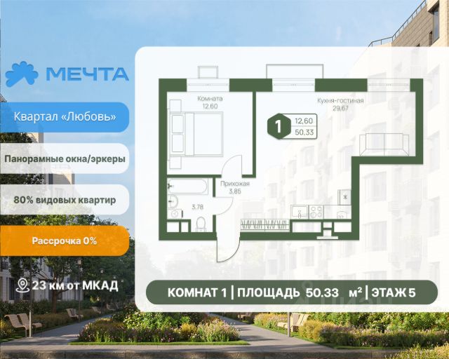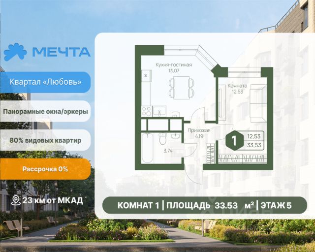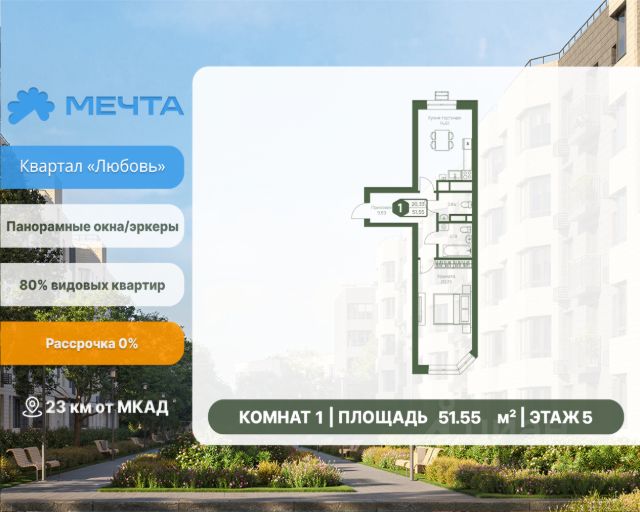 Рассрочка 0% от застройщика! Продается однокомнатная квартира в квартале "Любовь" жилого комплекса "Мечта". Общая площадь квартиры: 37.09 кв. м, этаж 5 из 5. Срок сдачи: 4 квартал 2027 г. Отделка: Чернова ОСОБЕННОСТИ: - Просторная спальня - Гардеробная - Балкон - Высота потолка: 2.7 метра Квартал "Любовь" — это пять пятиэтажных домов, где продумано действительно всё. Здесь каждая квартира получает больше воздуха и света благодаря панорамным окнам и эркерам. А лифты в малоэтажном доме — большая редкость для Подмосковья, которая делает жизнь комфортнее с первого и до последнего этажа. Просторные мастер-спальни и продуманные планировки — визитная карточка квартала. А из 80% квартир открываются отличные виды: на зелёную зону, центральный парк, природный заказник или реликтовое озеро. В вашем дворе будет собственный детский сад, а в шаговой доступности — образовательный кампус, лес и Парк Мечты. Всё рядом, всё для жизни. Жилой комплекс "Мечта" расположен в 23 км от МКАД по Дмитровскому или Ленинградскому шоссе. ТРАНСПОРТНАЯ ДОСТУПНОСТЬ: - 15-20 минут на общественном транспорте до МЦД-1 "Лобня" - 30-35 минут на общественном транспорте до метро "Физтех" - 45-50 минут до станций метро "Савеловская" или "Белорусская" - 30 минут на автомобиле до Москвы Инфраструктура включает в себя муниципальную школу и детские сады, кабинет врача общей практики, множество кафе и ресторанов, а также различные спортивные и детские площадки. В пешей доступности от жилого комплекса расположены лес и три реликтовых озера — Долгое, Круглое и Нерское, а также реки Альба, Уча и Волгуша. Территория жилого комплекса закрыта для посторонних, находится под охраной и патрулируется. На въезде расположен КПП. Камеры видеонаблюдения работают круглосуточно на всей территории. Вы и ваши дети будете чувствовать себя в безопасности.