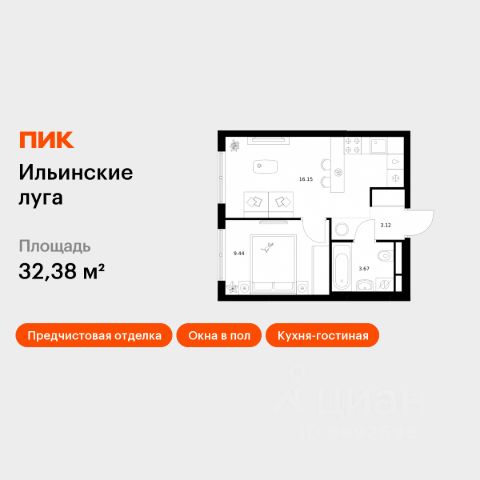 Продаётся 1-комн. квартира площадью 33,16 кв.м на 9 этаже 9 этажного дома (Корпус 3.2, Секция 3) проекта ПИК Ильинские луга. Светлый просторный подъезд на уровне земли, функциональная планировка, большие окна, предчистовая отделка. Жилой район "Ильинские луга" находится в 10 километрах от МКАД по Новорижскому шоссе, в 20 минутах на автомобиле от станций метро "Волоколамская", "Тушинская" и "Строгино". В будущем ближе к проекту, в 9 минутах пути на машине, откроется станция "Ильинская" Рублёво-Архангельской линии, которая будет соединять Арбатско-Покровскую линию и Большую кольцевую линию. Сейчас в квартале начались продажи в корпусах 3.2, 3.3, 3.4, 3.5 и 3.6. "Ильинские луга" — масштабный проект, в который входит девять детских садов, четыре школы и поликлиника. Он строится в престижном и экологичном районе среди лесов и памятников природы. За 5 минут от жилого квартала можно доехать до Рублёво-Успенского шоссе, а за 30 минут — до центра Москвы. До крупного торгового центра "РИГАМОЛЛ" всего 5 минут на автомобиле, а до ТЦ "Твой дом" и гипермаркета "Глобус" — 10 минут. В "Ильинских лугах" строятся только девятиэтажные дома — такая архитектура соответствует спокойной жизни за городом. В каждом дворе-парке есть места для отдыха, детские и спортивные площадки. А ещё, здесь уже открыт большой PlayHub "Гравити" — современное игровое пространство с космической тематикой, холмами, зонами для игр и отдыха жителей любого возраста. На первых этажах уже работают магазины, кафе и пекарни. Места для отдыха от "Ильинских лугов" тоже недалеко: 10 минут на машине — и вы в музее-усадьбе "Архангельское". Также рядом находится Лохин остров — памятник природы, где водятся речные черепахи, есть места для кемпинга и возможность сплавиться по реке. Артикул 999821 (Застройщик ООО "СЗ "ГРАДОЛИМП")