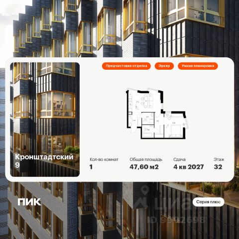 Продаётся 1-комн. квартира площадью 47,6 кв.м на 32 этаже 32 этажного дома (Корпус 1.1.3, Секция 3) проекта ПИК Кронштадтский 9. Светлый просторный подъезд на уровне земли, функциональная планировка, большие окна, предчистовая отделка. Жилой квартал "Кронштадтский 9" возводится в Головинском — в одном из районов с лучшей экологией в Москве. Совсем рядом станция метро "Водный стадион" — до неё 3 минуты пешком. Поездка на машине до Ленинградского шоссе займёт 2 минуты, до ТТК — 10 минут, а до МКАД — 16 минут. Недалеко от жилого квартала находятся парки и пруды — спокойные места для прогулок и отдыха. В "Кронштадтском 9" можно купить квартиру в уже готовом корпусе и сразу получить ключи. В проект входит 10 корпусов с просторными и светлыми подъездами, два детских сада и подземный паркинг. Внутри квартала будут уютные дворы-парки с детскими площадками и местами для отдыха. А чуть дальше, чтобы шум не беспокоил жителей домов, мы построим спортивные площадки. Во всех квартирах в этом проекте предчистовая отделка, с которой легче реализовать ваши дизайнерские идеи. В районе, где строится "Кронштадтский 9", есть всё для комфортной жизни: школы, сады, вузы, магазины и крупные торговые центры "Водный" и "Метрополис". В 15 минутах ходьбы — парк у Головинских прудов, в 18 минутах — парк "Дружба". Оба для прогулок, пробежек и отдыха от дома и работы. Ключевая особенность новых корпусов проекта — это особый архитектурный образ, разработанный бюро М.А.М. Здания привлекают внимание контрастом светлых фасадных поверхностей с тёмными, более детализированными элементами. Архитектурные приёмы формируют связь с городским контекстом: низкоэтажные корпуса естественно вписываются в окружающий ландшафт, в то время как 32-этажная башня добавляет вертикальный акцент, усиливающий общий облик квартала. В "Кронштадтском 9" умные планировки: вы сами выбираете, как их использовать, чтобы ваша квартира была максимально комфортной именно для вас. Например, постирочная может стать студией звукозаписи, а зона для гардероба — кабинетом. В новых корпусах есть квартиры с кухней-нишей, сквозным санузлом и мастер-спальней с собственной ванной. Квартиры продаются с предчистовой отделкой. Это значит, что к моменту получения ключей в доме уже закончатся самые грязные и шумные работы, а вам будет легче реализовать дизайнерские идеи. Рядом с проектом есть всё необходимое. В паре минут пешком — торговые центры "Гавань" и "Водный", а в 7 минутах на машине — большой ТРЦ "Флотилия". В шаговой доступности аптеки и детская городская поликлиника. Доехать до взрослой поликлиники можно за несколько минут. Вокруг несколько интересных мест для прогулок, в том числе с детьми. Можно арендовать лодку или просто понаблюдать за плывущими яхтами и парусниками на Северном речном вокзале, побродить по парку возле усадьбы Грачёвки или сходить в музей охоты и рыболовства. Артикул 967870 (Застройщик АО "Специализированный застройщик МАК8")