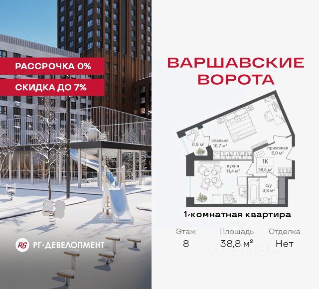 Рассрочка 0% + скидка 5%. Первый платёж 50% при ДДУ, второй 50% — через 12 мес. до ввода ЖК. Продаются 1-комнатные апартаменты 38,6 кв.м. в МФК "Варшавские ворота" на 9-м этаже 9 этажного дома. МФК "Варшавские ворота" — это проект, в котором учтен широкий спектр требований: от транспортной доступности и развитой инфраструктуры до архитектурной выразительности и экологического окружения. Апартаменты в МФК "Варшавские ворота" подойдут для тех, кто ищет продуманное жилье в Москве или готовый инвестиционный актив. Апартаменты здесь — это: - возможность жить комфортно в удобном городском формате — с природой, метро, сервисом и паркингом; - возможность купить лот с готовой отделкой, чтобы вложить минимальные инвестиции в ремонт и получить максимум возможностей от сдачи; - экономия на налоге на имущество, кадастровая стоимость апартаментов ниже ~ на 30% кадастровой стоимости квартиры; - высокая инвестиционная доходность объекта за счет более низкой цены покупки по сравнению с квартирой. Коротко о важном: - 1 минута пешком от м. Аннино; - Удобные выезды на Варшавское шоссе и МКАД; - Вид из окон на Битцевский лес и Аннинский лесопарк; - Высота потолков 2,7 - 3 м; - Закрытый двор-парк; - Школы и детские сады в 10-15 минутах пешком от дома; - Технические лоджии для размещения кондиционеров; - Подземный паркинг; - РГ-Девелопмент — ТОП-20 крупнейших застройщиков России. Проект сочетает в себе современную архитектуру и продуманное благоустройство с уникальным природным окружением. Всего в нескольких минутах от дома — девять парков, каскад прудов и крупнейшие лесопарковые зоны Москвы, создающие ощущение жизни в зеленом оазисе посреди мегаполиса. Архитектурная концепция - стиль Чикаго в Москве. Выполнена в минималистичной эстетике с использованием клинкера и декоративного кирпича. Фасады подчеркивают строгие линии и современный стиль, а входные группы разработаны московским бюро Syntaxis. Лобби оформлены с применением керамогранита, декоративной штукатурки и гипсовых панелей, детали из латуни добавляют изысканности. Пространство оживляют гербарии, композиции из сухоцветов и авторские панно. Проект находится в одной минуте пешком от метро "Аннино", в 12 минутах от станции "Улица Академика Янгеля" и рядом с МЦД-2 "Красный Строитель". Для автомобилистов предусмотрен прямой выезд на Варшавское шоссе и два съезда на МКАД, что позволяет быстро добираться в любую часть города. Среди планировочных решений представлены разнообразные форматы: от функциональных студий до просторных 4-комнатных квартир и апартаментов площадью от 22 до 105 м². Высокие потолки усиливают ощущение простора, а продуманные планировки включают мастер-спальни, гардеробные, угловые окна, объединённые кухни-гостиные и несколько санузлов. Центральное пространство комплекса — закрытый двор без машин. Он разделён на функциональные зоны: детские игровые комплексы, спортивные площадки, воркаут-зоны и уютные места для тихого отдыха. На первых этажах разместя