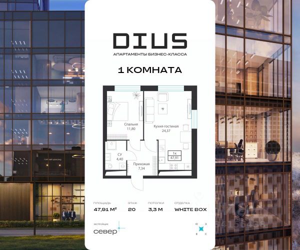 Сервисные апартаменты для жизни! Продаются 1-комнатные апартаменты 47.91 кв.м. на 20-м этаже 20-этажного комплекса. Преимущества лота: - Гардеробная - Отделка White box - Потолки 3,3 м - Доступ к сервисам комплекса класса Премиум DIUS — многофункциональный комплекс бизнес-класса на севере Москвы, сочетающий сервисные апартаменты, бизнес-центр класса А и торгово-развлекательную галерею. Проект, воплощающий современный подход к жизни в мегаполисе, позволяет объединить комфорт проживания, работу, деловые встречи и досуг в едином пространстве. На территории DIUS предусмотрены двухуровневый подземный паркинг с прямым доступом из лифта, гостевые парковочные места, а также бизнес-центр и торгово-развлекательная галерея. Территория комплекса закрыта для посторонних и благоустроена с учётом современных стандартов: качественное озеленение, прогулочные дорожки, зоны тихого и активного отдыха. Закрытая территория, современные лобби, коворкинги, спортивные зоны и общественные пространства создают условия для жизни, работы и отдыха. Резиденты комплекса могут воспользоваться профессиональными сервисами управляющей компании, включая уборку, техническую поддержку, обеспечение безопасности и доверительное управление для инвесторов. DIUS расположен в районе с развитой инфраструктурой и высоким спросом на аренду. В шаговой доступности — станция МЦД-2 "Гражданская" (5 минут пешком) и станции метро "Аэропорт" (15 минут пешком) и "Сокол". Быстрый выезд на основные магистрали Москвы обеспечивает удобную транспортную доступность: дорога до центра занимает около 25 минут, до Белорусского и Савёловского вокзалов — 15 минут, до аэропорта Шереметьево — 45 минут. В окружении DIUS — Тимирязевский и Петровский парки, ландшафтный парк "Ходынское поле", культурные и исторические объекты столицы, а также крупнейшие торговые и спортивные центры города. Такое соседство открывает разнообразные возможности для отдыха, прогулок и насыщенного досуга. В DIUS реализован формат отделки White Box: каждые апартаменты предоставляется будущему владельцу в современном и подготовленном под чистовую отделку состоянии. Условия покупки: - 100% оплата с максимальной выгодой - Рассрочка на срок до 24 мес. под 0% от застройщика - Трейд-ин с полным сопровождением Мы предлагаем несколько форматов покупки, чтобы вы могли выбрать оптимальный сценарий — исходя из ваших целей, возможностей и финансовых стратегий. Наши менеджеры будут рады ответить на все ваши вопросы - звоните нам напрямую по номеру в объявлении.