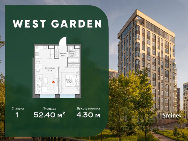 Комфортная и продуманная до мелочей 1-спальная квартира площадью 52.40 кв. м на 14 этаже в клубном доме 0 (13). Увеличенная площадь окон и высота потолков 4.30 м дарят впечатляющие виды на парки, зеленые зоны и природные заказники. West Garden - это собрание клубных домов высотой 12-14 этажей в собственном парке 16 гектаров вдоль реки. Просторный среднеэтажный квартал расположен на Минской улице, в респектабельном Западном округе столицы. Вокруг премиальное окружение и более 1000 гектаров парков. West Garden - это возможность обеспечить себе и своей семье лучшие условия для жизни в одном из самых привлекательных и зелёных районов столицы. Гармония природы дополнена здесь впечатляющими возможностями и привилегиями: • Расположение в зелёном Западном районе столицы вблизи центра и ключевых магистралей в окружении парковых зон (заказник "Долина реки Сетунь", Мосфильмовский пруд, Ботанический сад МГУ, природный заказник "Воробьёвы Горы", Парк Победы на Поклонной горе) • Современная лаконичная архитектура, у каждого дома свой индивидуальный облик и выразительный фасад с использованием натуральных и долговечных материалов (гранит, известняк, клинкерный кирпич) • Функциональные лобби с отделкой из дерева и натурального камня с высокими потолками до 7,8 м • Самый большой собственный парк для прогулок и отдыха: 8 га собственной закрытой и благоустроенной территории, а также 8 га прилегающего парка на набережной с зонами отдыха с шезлонгами, маршрутами для бега, пеших и велосипедных прогулок • Инфраструктурный центр Clubhouse только для жителей: клубная гостиная с террасой и творческой атмосферой по фирменному стандарту Friend`s Lab, детская игровая зона 300 кв. м по стандарту Kid`s Lab • Насыщенная и разнообразная инфраструктура для детей любого возраста: 8 развивающих детских площадок в парке, 3 детские площадки на благоустроенной набережной, площадка для отдыха и досуга подростков • Спортивная инфраструктура по стандарту Fit Lab: многофункциональные площадки для футбола, баскетбола, волейбола с трибуной для болельщиков, зона воркаута, теннисные столы, зона для йоги, беговая дорожка 3 километра, фитнес-центр только для жителей • Комфортный и просторный подземный паркинг на 1313 машино-мест, 482 келлера, автомойка только для жителей на четыре поста