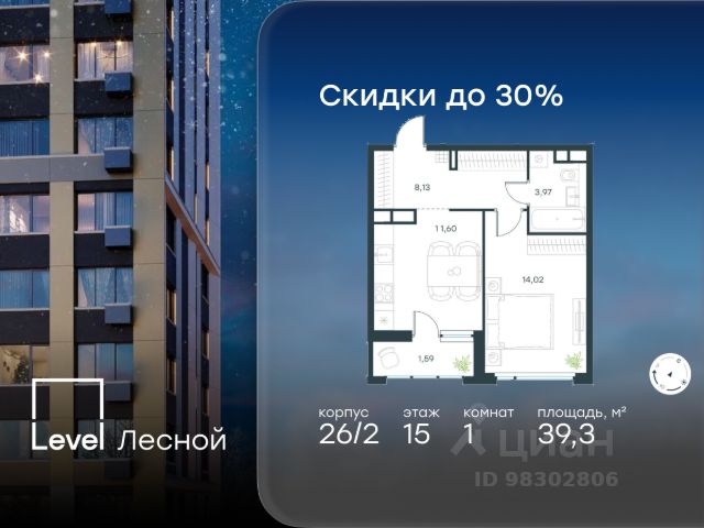 Цена указана с учётом скидки при 100%-й оплате, несубсидированной ипотеке, рассрочке (кроме программы "Рассрочка 0%"). В районе, утопающем в густой зелени лесов, многочисленных парков и скверов, продаётся 1-комнатная квартира площадью 39.30 кв.м без отделки. Квартира расположена на 15 этаже в жилом комплексе комфорт-класса Level Лесной (компания Level Group/Левел групп). Отличная транспортная доступность: - 25 мин. пешком до станции метро "Пятницкое шоссе"; - 28 мин. на автобусе до станции метро и МЦД-2 "Волоколамская"; - 11 мин. на авто до МКАД; - 25 мин. на авто до ТТК. Продуманный архитектурный проект: - Концепция проекта Level Лесной от бюро СПИЧ; - Высотность комплекса до 15 этажей с уникальными видами на лесные массивы и город; - Высота потолков до 3 м; - Современные окна высотой до 1,6 м, в части квартир предусмотрены окна в пол. Высота подоконников 0,6 м; Расположение: Level Лесной строится в зелёной зоне ближайшего Подмосковья, г.о. Красногорск в посёлке Отрадное. Шаговая и автомобильная доступность до метро и больших транспортных артерий города. За 25 минут вы дойдёте до станции метро "Пятницкое шоссе", а за 20 минут на машине сможете доехать до станции метро "Тушинская". Район окружен роскошной зеленью лесов и парковых зон, занимающих территорию свыше 1 000 гектаров. Помимо благоприятной экологии, здесь множество возможностей для активного отдыха и поддержания физической формы. Облагороженная территории с полностью развитой инфраструктурой. На территории проекта находится детский сад и школа "Светлые Горы", которая входит в список лучших частных школ от Forbes Education (по данным на 2023г.). Кроме того, в пешей доступности расположено ещё 8 детских садов, а также запланировано открытие современной муниципальной школы. В непосредственной близости находятся сетевые супермаркеты и локальные магазины, аптеки, клиники, почта, библиотека, салоны красоты, рестораны, спортивные и творческие секции, развивающие детские центры. В 12 минутах пешком расположен торговый парк "Отрада" с продуктовым и строительным гипермаркетами, магазинами, кинотеатром и развлечениями для детей. Внутренняя инфраструктура: Мы знаем, как важно, чтобы магазины и сервисы были всегда рядом. В сданных корпусах Level Лесной уже расположена полностью готовая развитая инфраструктура. На первых этажах корпуса 27 предусмотрено ещё 14 коммерческих помещений. Благоустройство: Продуманное пространство и аура приватного европейского городка рождают чувство лёгкости и расслабления у каждого, кто попадает на территорию проекта. Концепцию общественных площадок разработали в партнёрстве два архитектурных бюро: Highlight Architecture и SCAPE. В безопасных дворах без машин каждый обязательно найдёт себе место для вдохновения, отдыха и спорта.