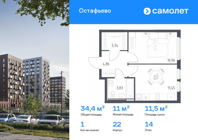 Строим кварталы для жизни с заботой о будущем. Предлагается 1-комнатная квартира комфорт-класса 34,44 кв.м в корпусе 22 на 14 этаже, в ЖК "Остафьево" Квартира без отделки. Доступность опции "отделка" и возможность комплектации мебелью и декором уточняйте у застройщика. Приобрести квартиру возможно по специальным акциям от застройщика, с текущими условиями акций можно ознакомиться в блоке "Акций". Цена динамическая и может отличаться, уточняйте актуальность у застройщика. "Остафьево" — масштабный жилой комплекс в Новой Москве, рядом с одноименным музеем-усадьбой и городским парком "Барыши". До станций МЦД "Щербинка" и "Остафьево" можно добраться на автомобиле за 57 минут. Часть домов уже сдана, на территории открыты две школы и три детских сада, а в будущем будет построена поликлиника, ТЦ, еще одна школа и три детских сада. Все необходимое рядом: на первых этажах домов работают магазины, аптеки и кафе. Дворы — приватные мини-парки без машин и посторонних. Кроме игровых площадок, для детей обустроили тематический плейхаб "Маяк". В будущем появятся плейхаб "Алиса в стране чудес", арт-объект "Тропа зеркал", а также большой ландшафтный парк. В квартале — монолитные дома комфортной высоты, от 10 этажей. Светлые фасады украшают кирпичные вставки в теплых природных оттенках.