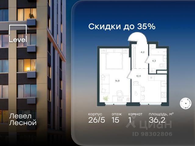 Цена указана с учётом скидки при 100%-й оплате, несубсидированной ипотеке, рассрочке (кроме программы "Рассрочка 0%"). В районе, утопающем в густой зелени лесов, многочисленных парков и скверов, продаётся 1-комнатная квартира площадью 37.60 кв.м без отделки. Квартира расположена на 15 этаже в жилом комплексе комфорт-класса Левел Лесной (компания Level Group/Левел групп). Жилой квартал Левел Лесной расположен в посёлке Отрадное Красногорского района Московской области. Это уникальный природный уголок вблизи района Митино. Посёлок окружён обширными лесными массивами. Обилие зелени создаёт благоприятный экологический фон и превращает этот район в оазис спокойствия и единения с природой. Расположение и инфраструктура: - Район окружен роскошной зеленью лесов и парковых зон, занимающих территорию свыше 1 000 гектаров, среди них лесопарк внутри жилого комплекса, загородный парк "Отрада", Митинский лесопарк, набережная реки Синички. - Идеальные условия для активного отдыха в любое время года: пешие и велопрогулки, бег, зимой - лыжи и катание на ватрушках. - На территории ЖК - частная школа "Светлые Горы", входящая в топ лучших школ Москвы и Подмосковья (Forbes Education, 2023), и детский сад, в пешей доступности расположены 9 детских садов. - На территории жилого комплекса - сетевые супермаркеты, локальные магазины, аптеки, салоны красоты, рестораны и другие объекты инфраструктуры в сданных корпусах. В 12 мин. пешком - крупный торговый парк "Отрада" с гипермаркетами, кинотеатром и детскими развлечениями. Отличная транспортная доступность: - 25 мин. пешком до станции метро "Пятницкое шоссе"; - 28 мин. на автобусе до станции метро и МЦД-2 "Волоколамская"; - 11 мин. на авто до МКАД; - 25 мин. на авто до ТТК. Продуманный архитектурный проект: - Концепция проекта Левел Лесной разработана бюро СПИЧ; - Высотность комплекса до 15 этажей с уникальными видами на лесные массивы и город; - Высота потолков до 3 м; - Современные окна высотой до 1,6 м, в части квартир предусмотрены окна в пол. Высота подоконников 0,6 м. Благоустройство: Продуманное пространство и аура приватного европейского городка рождают чувство лёгкости и расслабления у каждого, кто попадает на территорию проекта. Концепцию общественных площадок разработали в партнёрстве два архитектурных бюро: Highlight Architecture и SCAPE. В безопасных дворах без машин каждый обязательно найдёт себе место для вдохновения, отдыха и спорта.