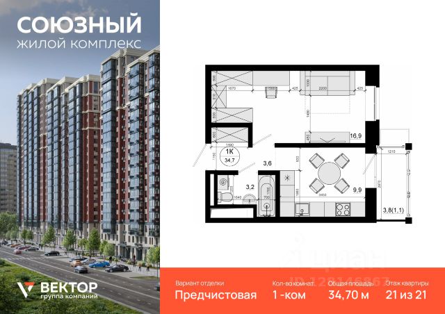 Продается 1-комн. квартира площадью 34,7 кв.м на 21 этаже 21 этажного дома в ЖК "Союзный" от федерального девелопера ГК "Вектор". Расположение, транспортная доступность Жилой комплекс "Союзный" — это квартал из 6 монолитных домов комфорт-класса высотой до 25 этажей, строящийся в 8-ом микрорайоне города Одинцово на улице Маковского. В продаже квартиры площадью от 37,2 до 88 кв. м, с потолками высотой 2,7 м, лоджиями, 2-мя санузлами в квартирах с 3-мя комнатами. Квартиры без отделки и с отделкой эконом, бизнес или комфорт класса. Квартал располагается на территории с отличной транспортной доступностью: - 8 км от МКАД; - 15 минут пешком до станции "Одинцово" МЦД-1; - рядом находится автобусная остановка, от которой можно доехать до метро "Парк Победы", "Киевская", "Юго-Западная"; На личном автотранспорте доехать от комплекса по Минскому шоссе к новой развязке с МКАД можно примерно за 20 минут. В качестве альтернативы можно выбрать Можайское шоссе. Даже в час пик передвигаться по нему можно со скоростью 50 км/ч. Кроме того, можно выбрать платную трассу Северный обход Одинцово. Путь от квартала до Северо-Западной хорды на автомобиле займет 25-35 минут, а до ТТК и Садового кольца - 1 час. В квартале запланировано строительство торгового центра, детского сада на 245 мест (сдача - 4 кв 2025 г.), многоуровневой открытой стоянки на 257 автомобилей, многоуровневого подземного паркинга, наземно-подземного паркинга с эксплуатируемой кровлей и других объектов. На внутренней территории квартала разместятся детский игровой комплекс с резиновым покрытием, спортплощадка, зоны отдыха для взрослых, деревья, кустарники и газоны. В шаговой доступности от ЖК "Союзный" располагаются школа, детский сад, профучилище, несколько ТЦ, кинотеатр "Юность", Ледовый дворец, сквер Союзный, Глазынинский пруд с качелями и площадкой для хоккея. В районе ЖК нет промышленных производств, а совсем близко начинаются лесные массивы, занимающие площадь свыше 70 000 га. Этот район считается одним из самых экологически чистых в Подмосковье.*
