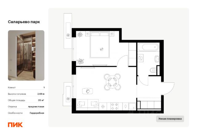 Продается однокомнатная квартира с отделкой в 7 фазе города-парка "Первый Московский". Общая площадь квартиры - 41,1 кв. м, этаж 20 из 20. Срок сдачи - 1 квартал 2027 года. Тип дома - монолитный. ТОЛЬКО ДО 28 ФЕВРАЛЯ: • Рассрочка до 13 месяцев с первоначальным взносом от 10% • Ежемесячный платеж от 50 000 руб. *подробную информацию по скидкам и акциям уточняйте в отделе продаж. Корпус состоит из 3 секций. Город-парк "Первый Московский" расположен всего в 7 км по Киевскому шоссе от МКАД на территории Новой Москвы. Из города-парка прямой выезд на Киевское шоссе и трассу Солнцево-Бутово-Варшавское шоссе. ТРАНСПОРТНАЯ ДОСТУПНОСТЬ: - 5 мин. на личном автомобиле или 10 мин. на автобусе 189 и 147 до станции метро "Филатов Луг" - 25 мин. пешком до станции метро "Филатов Луг" ИНФРАСТРУКТУРА: Около 7 фазы запланировано строительство детского сада, школы, 2 многоуровневых паркингов. Также на территории проекта есть все необходимые объекты действующей социальной и бытовой инфраструктуры: 8 детских садов, 5 школ, ТЦ, магазины, паркинги, аптеки и др. БЛАГОУСТРОЙСТВО: - Дворы без машин - Игровые зоны для детей, зоны для занятия спортом, зоны для отдыха с навесами/качелями - Детские площадки разделены по возрастным группам - Пешеходный и веломаршрут с двухполосной велодорожкой 2,5 м в ширину - Озеленение с растениями всесезонного цветения ОСОБЕННОСТИ АРХИТЕКТУРЫ: В каждой секции 3 корпуса предусмотрены: - колясочные во входных группах - кладовые помещения с -1 по 20 этажи - коммерческие помещения на 1 этажах - по 4 лифта: 2 пассажирских, 2 грузовых - видеонаблюдение, установленное в холлах первых этажей, у подъездов и на прилегающей территории АВТОРСКИЙ ДИЗАЙН: Входные группы выполнены по авторскому дизайну, оснащены системой "тёплый пол". В каждой входной группе будет располагаться комфортабельная зона ожидания с мягким диваном, акцентными пуфами и столиком.