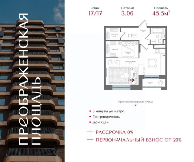 Рассрочка 0% с первоначальным взносом от 20% Квартира на 17 этаже в жилом комплексе премиум-класса "Преображенская площадь". Общая площадь: 44.5 кв.м. Проект премиум-класса в историческом районе Москвы. До метро "Преображенская площадь" 3 минуты пешком. Квартиры сдаются без отделки и в свободной планировке, чтобы жители могли оформить пространство с учетом своей индивидуальности. Высота потолков от 3,15м, широкоформатное остекление, 3-5 квартир на этаже. Система Умный дом. Дизайнерские лобби. Внутренний двор 1,5 га функциональное и безопасное пространство для игр, работы и занятий спортом. Пешеходный променад для прогулок. Дома переменной этажности. Есть подземный паркинг. Жилой комлекс находится в окружении парков Сокольники, Черкизовский, Измайловский, заповедника Лосиный остров и ВДНХ, а также вблизи пешеходной набережной. Комфортная удаленность от центра: 7 минут на автомобиле до ТТК, 8 минут до Садового кольца, 25 минут до Кремля.