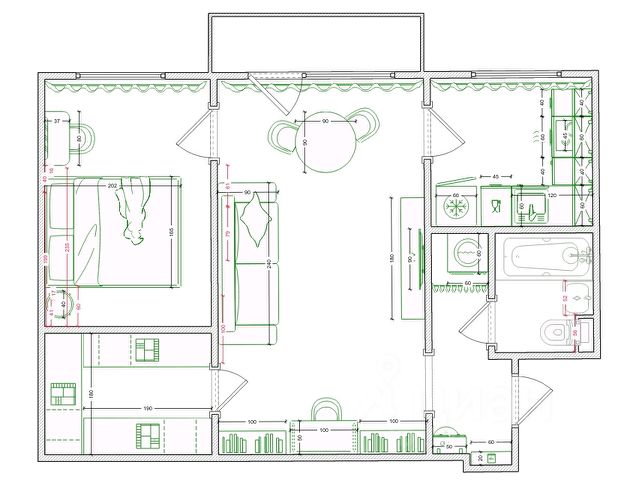 - план: кухня-гостиная и две спальни, две гардеробные и два сан.узла, почти все стены не несущие;