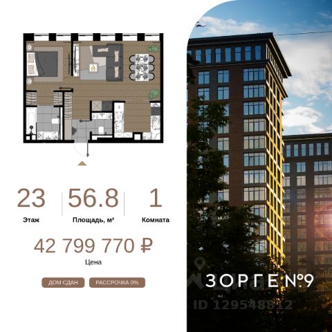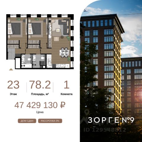 "Зорге 9" — готовые апартаменты бизнес-класса на Ходынке. 10 минут до Москва-Сити. Архитектура: 3 современных корпуса с фасадами в стиле архитектуры Нью-Йорка и с сервисами премиальных отелей, высотой до 23 этажа. Строгие линии, панорамные окна создают ощущение неподдельной роскоши и комфортной жизни в сердце мегаполиса. Проект награжден авторитетной премией European Property Awards. Резиденции: Свободная планировка, небольшая глубина этажа, огромные панорамные окна в пол до 3,6 м и высота потолков до от 3,3 до 4,3 м позволяют реализовать самые смелые концептуальные идеи и создать идеальный интерьер с учетом всех пожеланий. Вдохновляющие виды на город украсят ваш апартамент лучше любой картины. Есть возможность приобретения дизайн-проекта и полной меблировки апартаментов от партнеров девелопера. Расположение: 3 мин. пешком до парка Березовая роща 10 мин. пешком до Ходынского поля 10 мин. до ТЦ Авиапарк 30 минут до Шереметьево 10 мин до Москва-Сити или 1 станция до Москва-Сити 5 минут до ТТК 4 станции метро в шаговой доступности: 6 мин м. Полежаевская (фиолетовая ветка) 7 мин МЦК Зорге (МЦК) 7 мин м. Хорошевская (голубая ветка) 10 мин МЦК Хорошёво (МЦК) Благоустройство: Собственный парк 2 га с амфитеатром и поющими фонтанами. В парке высажено 136 деревьев и более 11 000 кустов и мелких растений из немецких питомников. Площадка для йоги и воркаут-зона со спортивными площадками. Теннисные столы и детский плейхаб Две башни Авторское гранд-лобби В лобби предусмотрена лаундж-зона, чайная с камином, комната для хранения велосипедов и колясок. Доступ по системе FACE ID. В отделке лобби и лифтовых холлов использован декоративный камень итальянского бренда Atlas Concorde Пентхаусы На верхнем уровне комплекса расположены роскошные просторные пентхаусы с высотой потолка до 4,2 метра и панорамными окнами до 3,6 метров, открывающими великолепные виды на столицу. Пентхаусы с выходами на собственные приватные террасы на кровле, площадью от 150 кв. м являются жильем high-уровня, демонстрирующим высокий статус владельца.