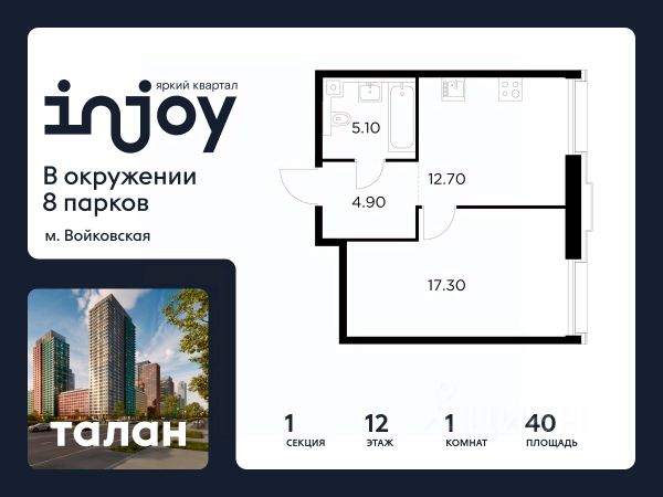 Прямая продажа от застройщика. В жилом квартале, расположенном в Войковском районе Москвы, продаётся 1-комнатная квартира площадью 40 кв.м без отделки. Квартира расположена на 12 этаже 35-этажного дома, корпус 1, в жилом квартале бизнес-класса INJOY. INJOY отделен от Ленинградского шоссе исторической застройкой и расположен всего в одном километре от магистрали: это возможность быстро добраться до центра или в любой район города по МКАДу или ТТК. Для автомобилей в INJOY — удобный подземный паркинг с доступом на лифте. Здесь же расположены кладовые площадью от 2,1 до 9 кв. м. Усилители сотового сигнала в лифтах и паркинге позволяют вести важные разговоры, не прерываясь на полуслове. Десятки мест отдыха вокруг INJOY дарят детям и взрослым запоминающиеся развлечения в любую погоду: от прогулок по паркам и природным зонам до интересного досуга в кругу семьи или друзей. 10 минут до парка Покровское-Стрешнево 12 минут до усадьбы Михалково 15 минут до Химкинского водохранилища 7 минут до ТРЦ "Метрополис" INJOY расположен в развитом сформировавшемся районе, что обеспечивает жителям обширную инфраструктуру в пешей доступности. МЦК "Балтийская" - 200 м Ленинградское шоссе - 1 км м. Войковская - 1 км ТТК - 7 км В проекте INJOY три очереди, разновидность которых формирует силуэт живого мегаполиса. Архитекторы международного бюро AI Studio придали индивидуальность каждому корпусу, чтобы все уголки INJOY обрели особенный характер. Планировки и форматы квартир уникальны: пентхаусы, квартиры с террасами, мастер-спальнями, выходом на променад, угловым остеклением, лоджиями, гардеробными, кладовыми и постирочными. Внутренний двор INJOY продолжает общую концепцию благоустройства и включает в себя: три детские площадки для разных возрастов, зону work-out, природную озеленённую зону, променад с зонами для релакса, йоги и амфитеатром с арт-объектами. Закрытый двор, видеонаблюдение и контроль доступа обеспечивают безопасность каждому жителю комплекса. Стоимость квартиры - 21490800 Р. Срок сдачи - 1 квартал 2027. Более подробную информацию по объекту уточняйте по телефону и в отделе продаж.