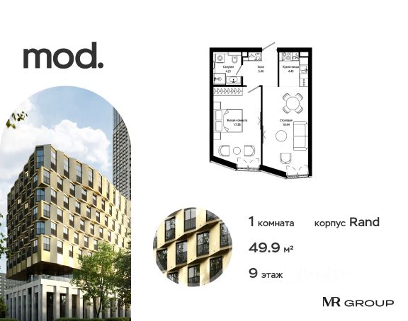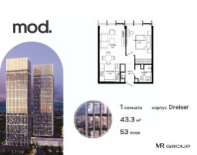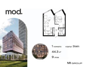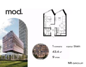 Прямая продажа от застройщика. Продается 1-комнатная квартира общей площадью 41.19 м² с предчистовой отделкой в ЖК премиум-класса Mod на 19-м этаже 44 этажного дома. Mod - жилой комплекс премиум-класса в историческом районе Москвы Марьина Роща. Пятый корпус станет частью единого высотного ансамбля, который поднимается над столицей и очерчивает новый горизонт города. Расположение корпуса Mod.C отличается тем, что виды на юго-запад Москвы не ограничены существующей застройкой. Почти все главные доминанты столицы — как на ладони: от сталинских высоток до небоскрёбов делового центра. Любоваться достопримечательностями будет вдвойне приятнее через панорамные окна. Закрытая территория жилого комплекса, продуманное благоустройство, эксплуатируемые кровли стилобата, образовательный центр с детским садом создают приватное пространство для тихой семейной жизни, а городская площадь с фонтанами, ресторан, супермаркет, коммерческая инфраструктура на первых этажах привносят созвучную с ритмом города динамику. Преимущества проекта: - В шаговой доступности новый деловой кластер Москвы - Выразительная авторская архитектура - Единственные в Москве фасады башен из натурального камня - Панорамное остекление и высота потолков до 4,8 м - Квартиры и апартаменты с отделкой MR Base - Многоуровневое благоустройство с зонированием на закрытой территории - Многофункциональный образовательный детский центр с детским садом - Двухуровневый подземный паркинг Транспортная доступность: - 5 минут пешком до станции метро "Марьина Роща" - 3 минуты до ТТК - 15 минут до Цветного бульвара Компания MR Group предлагает своим клиентам специальные условия приобретения квартир в рамках программ ипотечного кредитования от банков-партнеров.