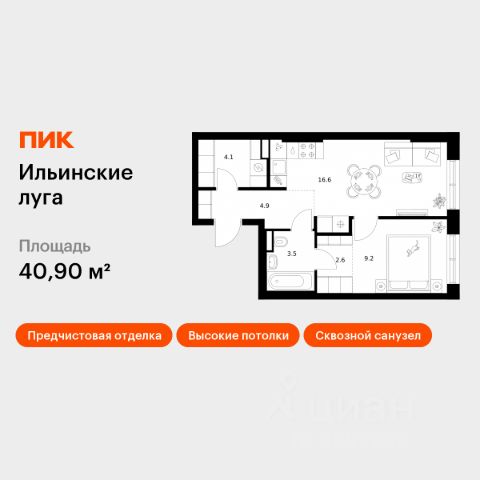 Продаётся 1-комн. квартира площадью 40,5 кв.м на 9 этаже 9 этажного дома (Корпус 3.3, Секция 1) проекта ПИК Ильинские луга. Светлый просторный подъезд на уровне земли, функциональная планировка, большие окна, c отделкой. Жилой район "Ильинские луга" находится в 10 километрах от МКАД по Новорижскому шоссе, в 20 минутах на автомобиле от станций метро "Волоколамская", "Тушинская" и "Строгино". В будущем ближе к проекту, в 9 минутах пути на машине, откроется станция "Ильинская" Рублёво-Архангельской линии, которая будет соединять Арбатско-Покровскую линию и Большую кольцевую линию. Сейчас в квартале начались продажи в корпусах 3.2, 3.3, 3.4, 3.5 и 3.6. "Ильинские луга" — масштабный проект, в который входит девять детских садов, четыре школы и поликлиника. Он строится в престижном и экологичном районе среди лесов и памятников природы. За 5 минут от жилого квартала можно доехать до Рублёво-Успенского шоссе, а за 30 минут — до центра Москвы. До крупного торгового центра "РИГАМОЛЛ" всего 5 минут на автомобиле, а до ТЦ "Твой дом" и гипермаркета "Глобус" — 10 минут. В "Ильинских лугах" строятся только девятиэтажные дома — такая архитектура соответствует спокойной жизни за городом. В каждом дворе-парке есть места для отдыха, детские и спортивные площадки. А ещё, здесь уже открыт большой PlayHub "Гравити" — современное игровое пространство с космической тематикой, холмами, зонами для игр и отдыха жителей любого возраста. На первых этажах уже работают магазины, кафе и пекарни. Места для отдыха от "Ильинских лугов" тоже недалеко: 10 минут на машине — и вы в музее-усадьбе "Архангельское". Также рядом находится Лохин остров — памятник природы, где водятся речные черепахи, есть места для кемпинга и возможность сплавиться по реке. Артикул 993931 (Застройщик ООО "СЗ "ГРАДОЛИМП")