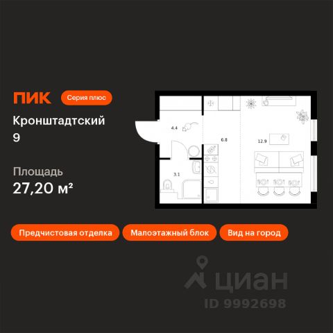 - комната 16,9 кв.м., кухня 16,9 кв.м., ванная комната 4,5 кв.м., гардеробная 4,3 кв.м., коридор 5,3 кв.м.