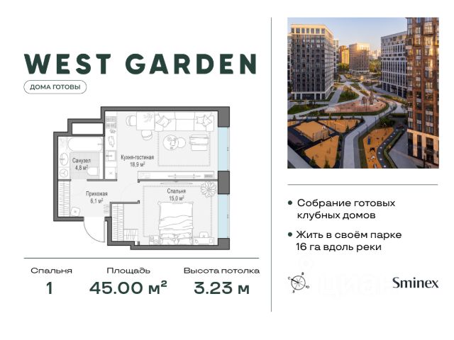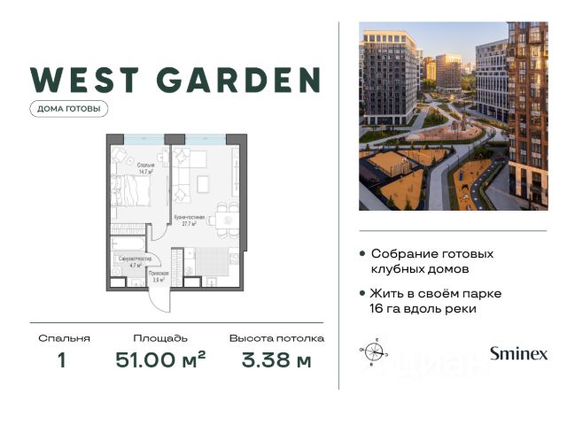 Комфортная и продуманная до мелочей 1-спальная квартира площадью 50.90 кв. м на 11 этаже в клубном доме 13. Увеличенная площадь окон и высота потолков 3.38 м дарят впечатляющие виды на парки, зеленые зоны и природные заказники. West Garden - это собрание клубных домов высотой 12-14 этажей в собственном парке 16 гектаров вдоль реки. Просторный среднеэтажный квартал расположен на Минской улице, в респектабельном Западном округе столицы. Вокруг премиальное окружение и более 1000 гектаров парков. West Garden - это возможность обеспечить себе и своей семье лучшие условия для жизни в одном из самых привлекательных и зелёных районов столицы. Гармония природы дополнена здесь впечатляющими возможностями и привилегиями: • Расположение в зелёном Западном районе столицы вблизи центра и ключевых магистралей в окружении парковых зон (заказник "Долина реки Сетунь", Мосфильмовский пруд, Ботанический сад МГУ, природный заказник "Воробьёвы Горы", Парк Победы на Поклонной горе) • Современная лаконичная архитектура, у каждого дома свой индивидуальный облик и выразительный фасад с использованием натуральных и долговечных материалов (гранит, известняк, клинкерный кирпич) • Функциональные лобби с отделкой из дерева и натурального камня с высокими потолками до 7,8 м • Самый большой собственный парк для прогулок и отдыха: 8 га собственной закрытой и благоустроенной территории, а также 8 га прилегающего парка на набережной с зонами отдыха с шезлонгами, маршрутами для бега, пеших и велосипедных прогулок • Инфраструктурный центр Clubhouse только для жителей: клубная гостиная с террасой и творческой атмосферой по фирменному стандарту Friend`s Lab, детская игровая зона 300 кв. м по стандарту Kid`s Lab • Насыщенная и разнообразная инфраструктура для детей любого возраста: 8 развивающих детских площадок в парке, 3 детские площадки на благоустроенной набережной, площадка для отдыха и досуга подростков • Спортивная инфраструктура по стандарту Fit Lab: многофункциональные площадки для футбола, баскетбола, волейбола с трибуной для болельщиков, зона воркаута, теннисные столы, зона для йоги, беговая дорожка 3 километра, фитнес-центр только для жителей • Комфортный и просторный подземный паркинг на 1313 машино-мест, 482 келлера, автомойка только для жителей на четыре поста