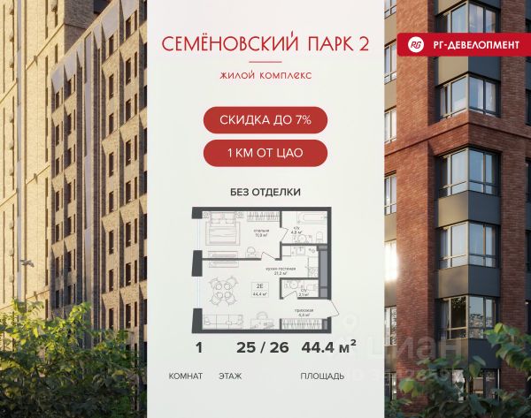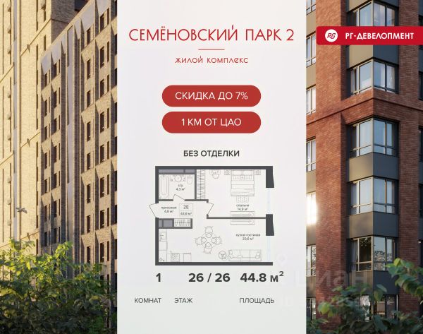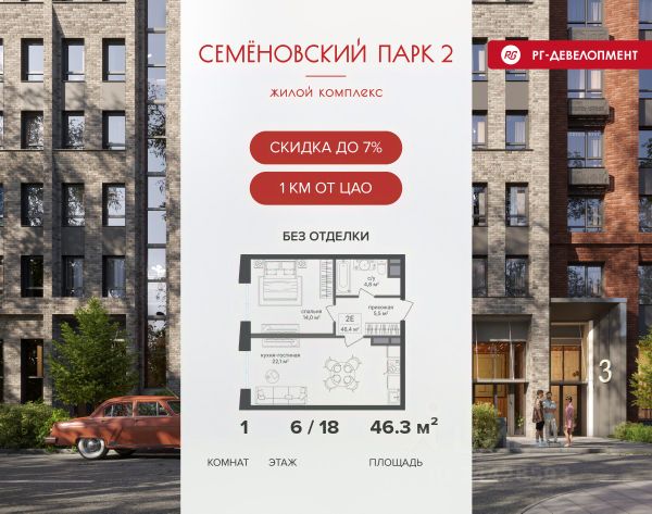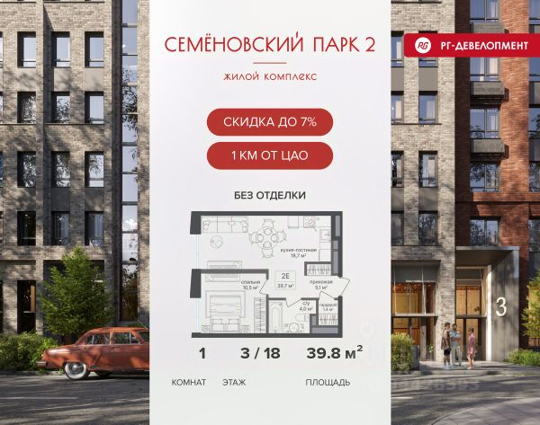 Ипотека для каждого! Полная стоимость кредита от 12,380% до 18,537%. Ставка от 0,11% в АО "Альфа-Банк", ген. лицензия ЦБ РФ 1326 от 16.01.2015. Ставка фиксируется на первые 12 месяцев, далее полная стоимость кредита от 22,022% до 24,599% ставка 21,59%. Первоначальный взнос — от 20,1% от стоимости квартиры. Срок кредитования — от 4 до 30 лет. Ипотека на весь срок! Полная стоимость кредита от 23,396% до 26,058% со ставкой 14,5%! Первоначальный взнос —от 20,01% от стоимости квартиры. Срок кредитования — от 3 до 30 лет. АО "Банк ДОМ.РФ" универсальная лицензия Банка России 2312 от 19.12.2018. Скидка 7% при покупке квартиры! Цена указана с учетом максимального размера скидки. Продается 1-к квартира 39,8 кв.м. в ЖК "Семеновский парк 2" на 3-м этаже 18 этажного дома. Компания "РГ-Девелопмент" предоставляет скидку на квартиры в жилом комплексе. Акция действительна до 31.03.2026 включительно. Чтобы воспользоваться предложением, необходимо подписать договор на приобретение недвижимости до 31.03.2026 включительно. Компания "РГ-Девелопмент" вошла в ТОП-10 девелоперов по объёму введённого жилья в "Старой Москве" по итогам 2025 года. Прямая продажа от застройщика! Квартиры без отделки. Срок сдачи корпуса - 1 кв. 2026 г., корпус сдан. ЖК "Семеновский парк 2" - это идеальное место для того, чтобы стать вашим домом. Проект расположен в исторической части Москвы вблизи Измайловского лесопарка, в 1 км от ЦАО. 4 станции метро отделяют вас от Красной площади и 15 минут на автомобиле - от Садового кольца.