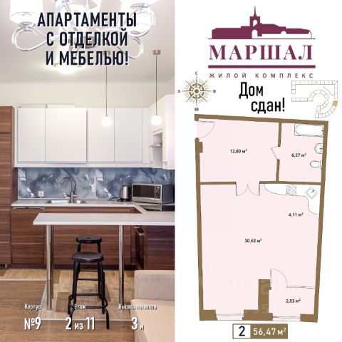Продаются 1-комнатные апартаменты в сданном доме (Маршала Рыбалко, 2К9), срок сдачи: IV-кв. 2011, общей площадью 56.7 кв.м., на 2 этаже. С чистовой отделкой и мебелью. МФК "Маршал" - столичный комплекс бизнес-класса, построенный по индивидуальному архитектурному проекту от известного архитектора. В 2014 году МФК "Маршал" стал лауреатом премии TREFI, одержав победу в номинации "Лучший строительный проект бизнес-класса в Москве". Разный формат недвижимости в составе МФК "Маршал" и развитая инфраструктура воплощают концепцию Live & Work ("Живи и работай"). В комплекс, помимо жилых помещений, входит деловой центр "Маршал" класса В +, где можно купить или взять в аренду офисное помещение. Таким образом, купив апартаменты в МФК "Маршал", вам не придется уезжать далеко, чтобы поработать в офисе. Развитая собственная инфраструктура включает: 2-х уровневый подземный паркинг на 1200 м/мест, детский сад, фитнес-центр с бассейном, уютное кафе, итальянский ресторан, салон красоты и другие предприятия социально-бытовой сферы. Территория комплекса огромная - даже по московским меркам: участок в 6,3 га. Застройка занимает лишь треть этой территории, на остальном пространстве предусмотрена зеленая зона с деревьями, которые сохранили при строительстве комплекса, включая уникальный вековой пробковый дуб. Здесь разбит сквер с аккуратными аллеями для прогулок, цветниками, а в центре установлен фонтан. В комплексе проведено ландшафтное озеленение и обустроены детские площадки с качелями, горками, игровыми комплексами. Площадки покрыты специальным мягким покрытием, которое минимизирует риск травматизма при падении ребенка. Вся территория комплекса огорожена и охраняется собственной службой безопасности! Комплекс имеет уникальное расположение рядом с транспортно-пересадочным узлом новой станции "Панфиловская", в пяти минутах ходьбы от станции метро "Октябрьское поле". К тому же, близ комплекса проходит улица Народного Ополчения, входящая в состав Северо-Западной хорды.